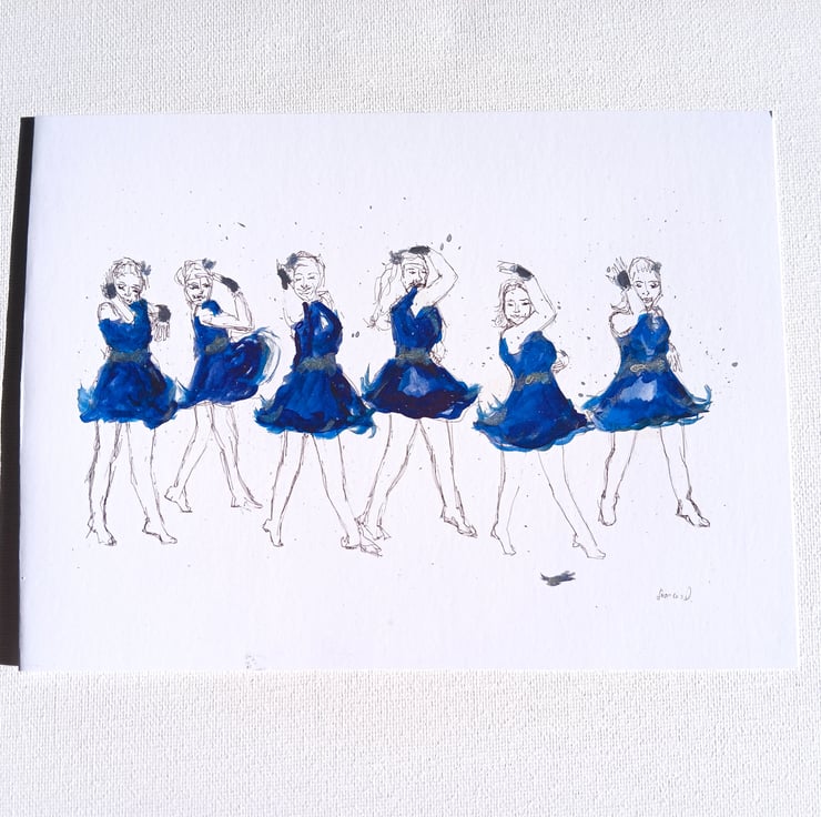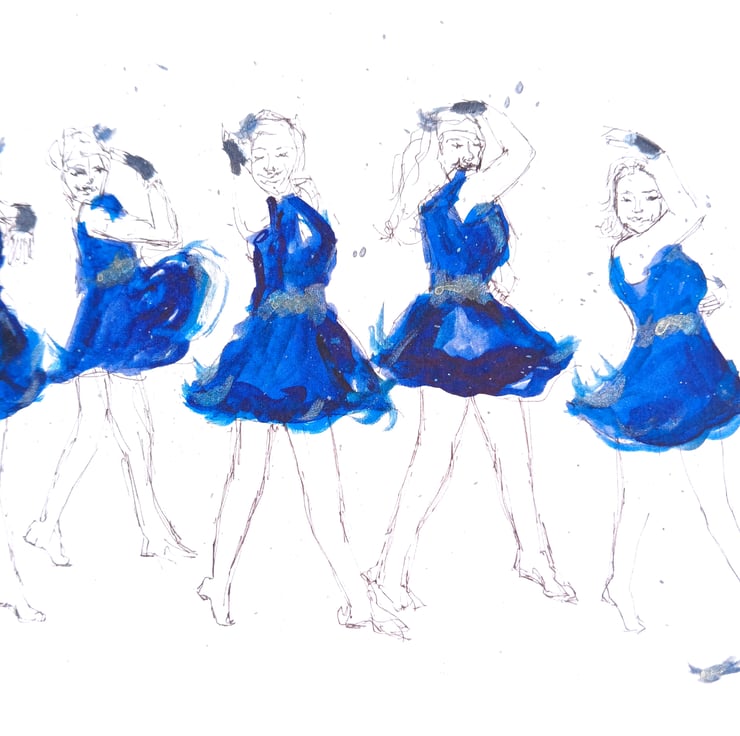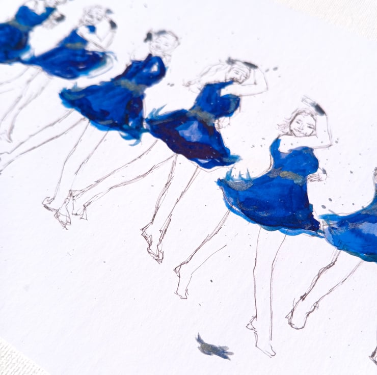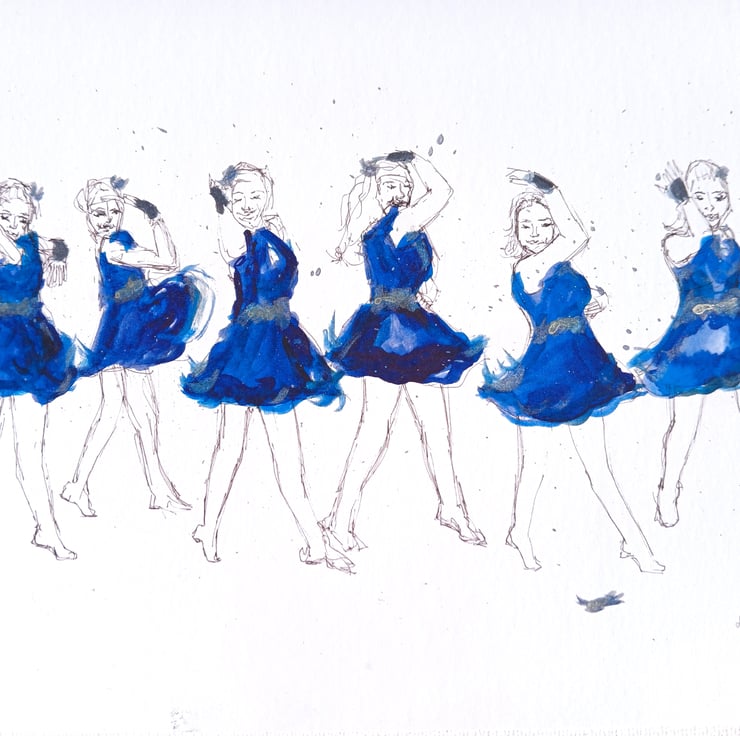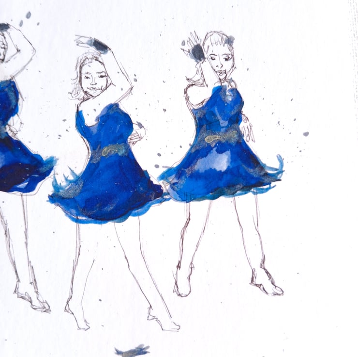 My abstract watercolour sketch of the regionals s1 group dance, showing the bright blue dresses and the lost feather.