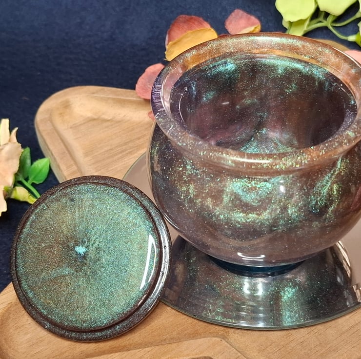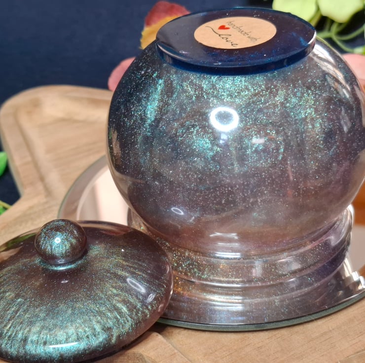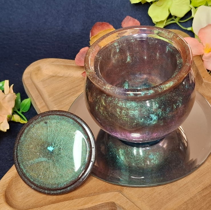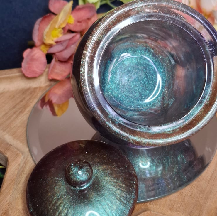 Lovely lidded handy pot. Useful for storing all kinds of small items like rings, earrings, and cufflinks. Handmade using craft resin and a chameleon paste. No two pieces are the same. If you have any specific colours you would like to have, please contact me.