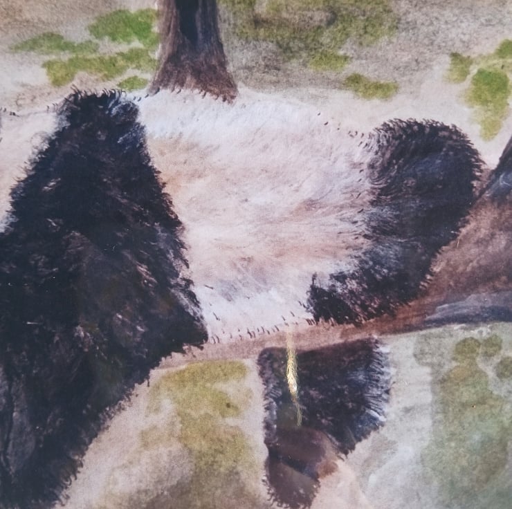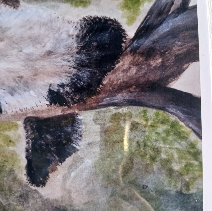 A print of my watercolour of a resting panda on a log in a forest.