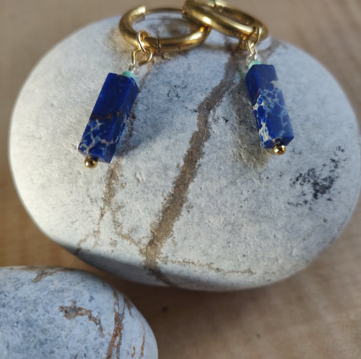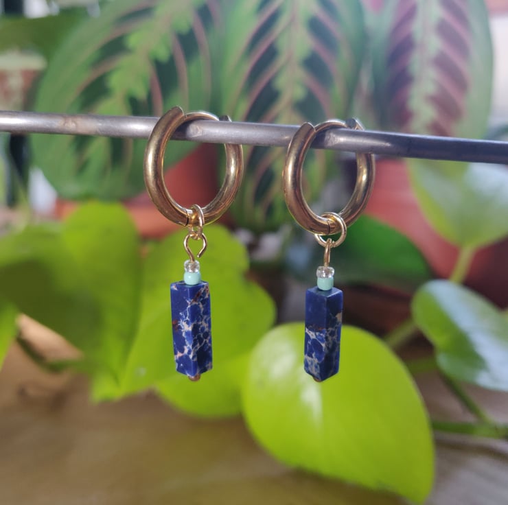 These bead earrings are handmade by me, using both Czech and Miyuki glass beads. The rectangle tube gemstone bead at the bottom is made of imperial jasper.