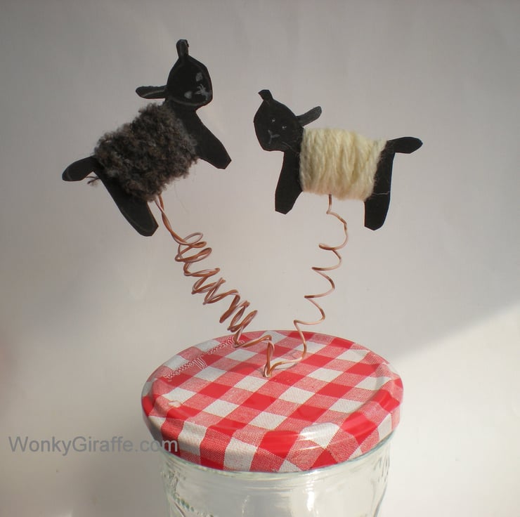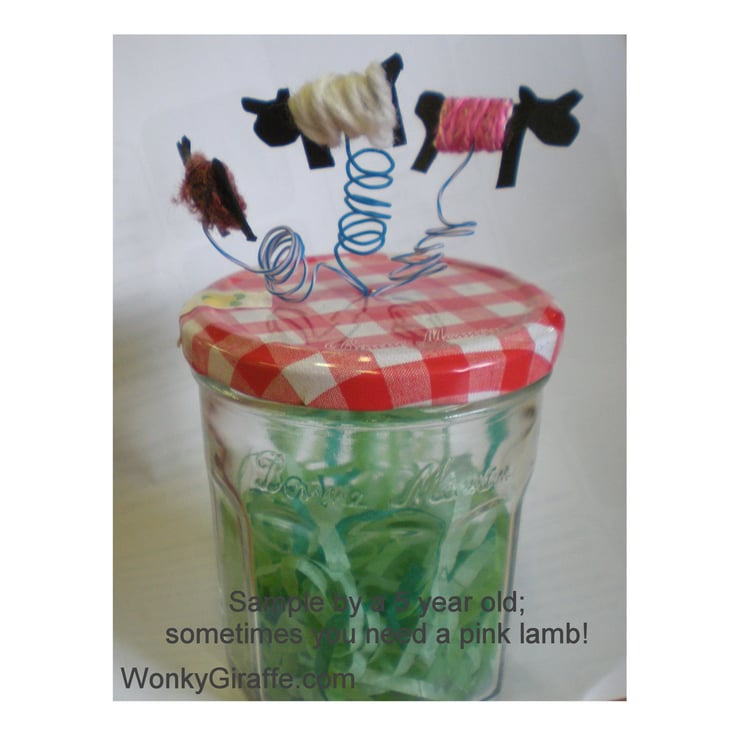 This idea developed for an eco activity celebrating springtime (and the local sheep). After many puns on “spring” and “springing” lambs etc. this arrived! It is a sweet activity; eco friendly, simple and great fun but with good scope for individual creativity too.(See the sample pink version!)