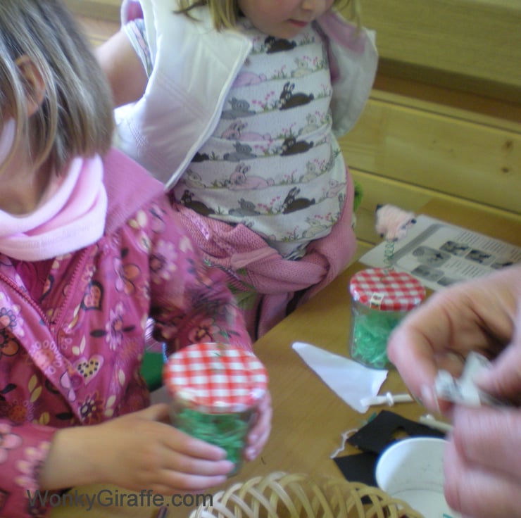 Clear photo instruction page with separate templates to print, for a pretty celebration of springtime or Easter! You will need a small piece of wire or a pipe cleaner, an empty jar and scraps of wool (I used natural colours, but apparently pink is also acceptable!).