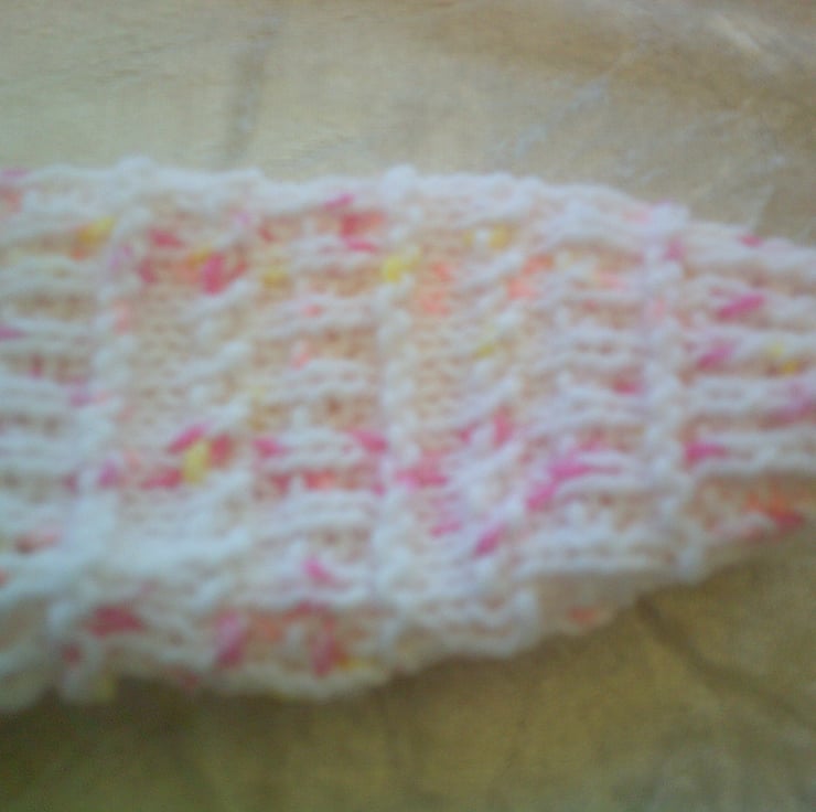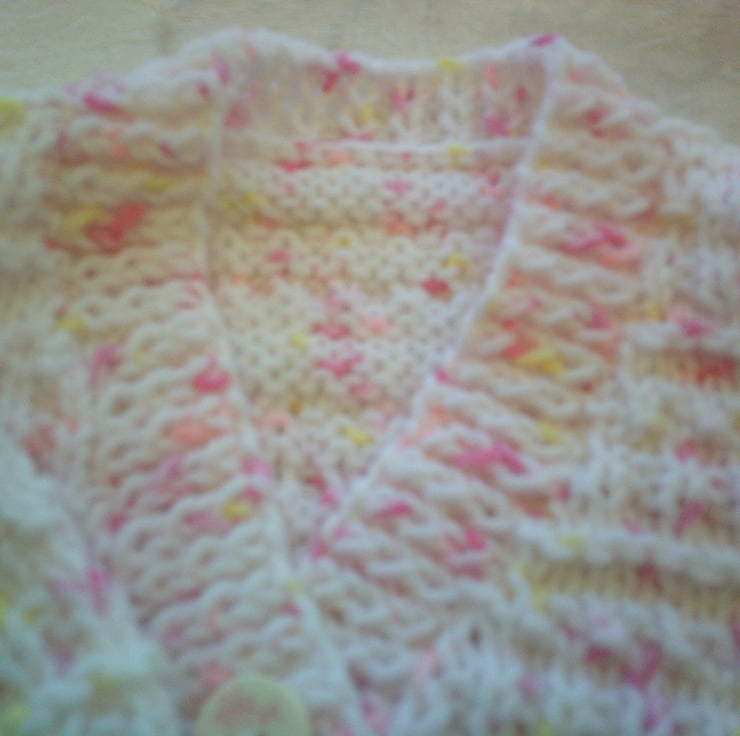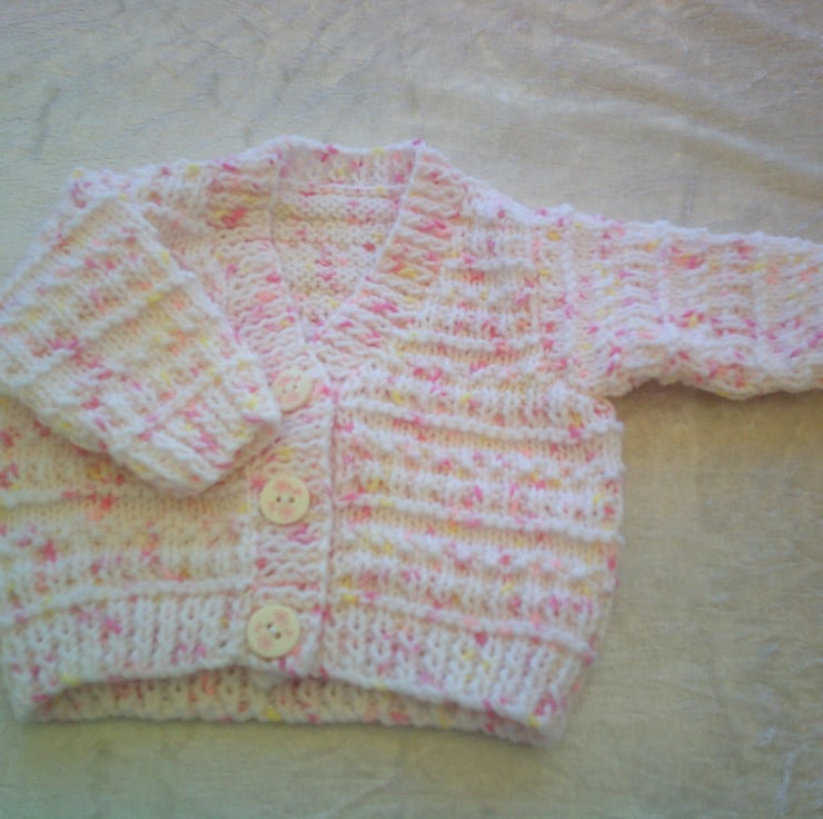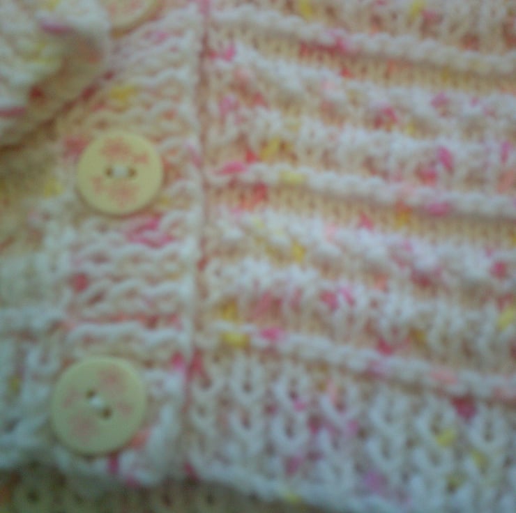 If is made in a white with pink and lemon flecks and has an all over design of a fancy rib. The buttons used come complete with a pink flower. It is perfect for an extra layer to keep baby warm.