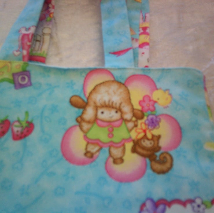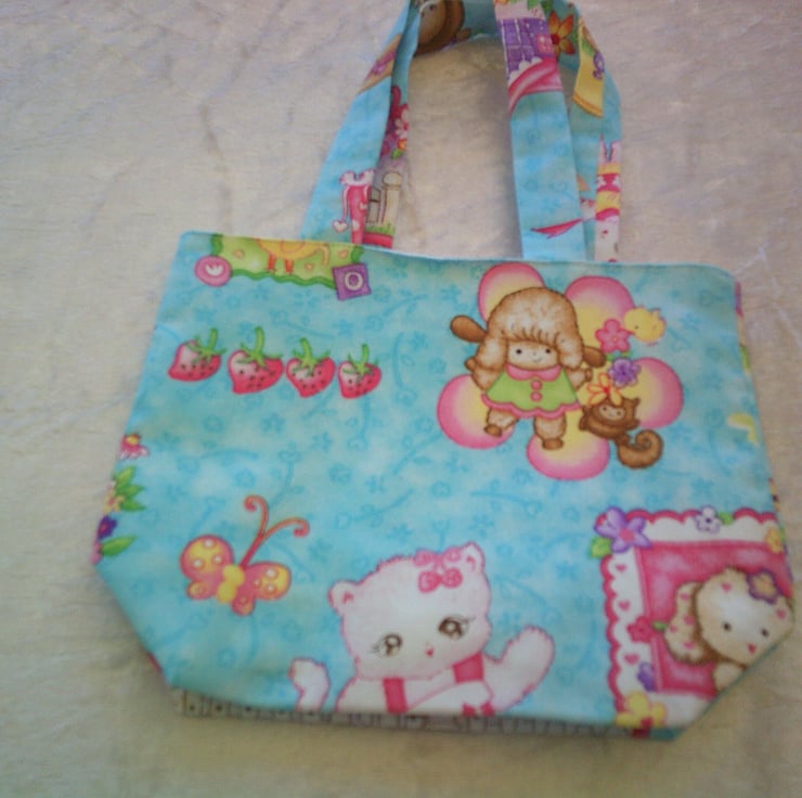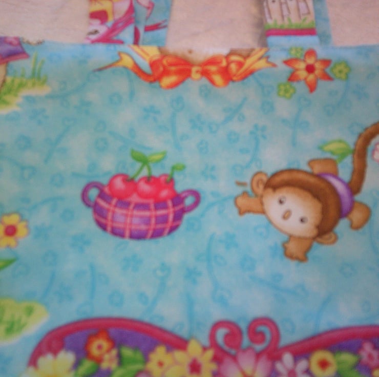 This Childs Handbag Fabric bag is made using a 100% Cotton Fabric featuring pretty cats and monkeys on a turquoise background.