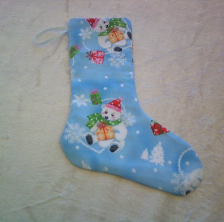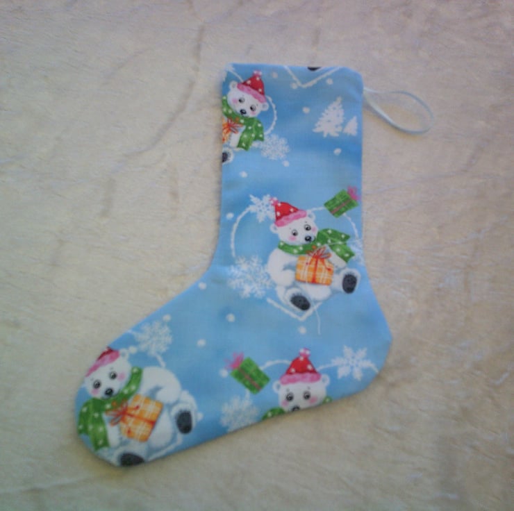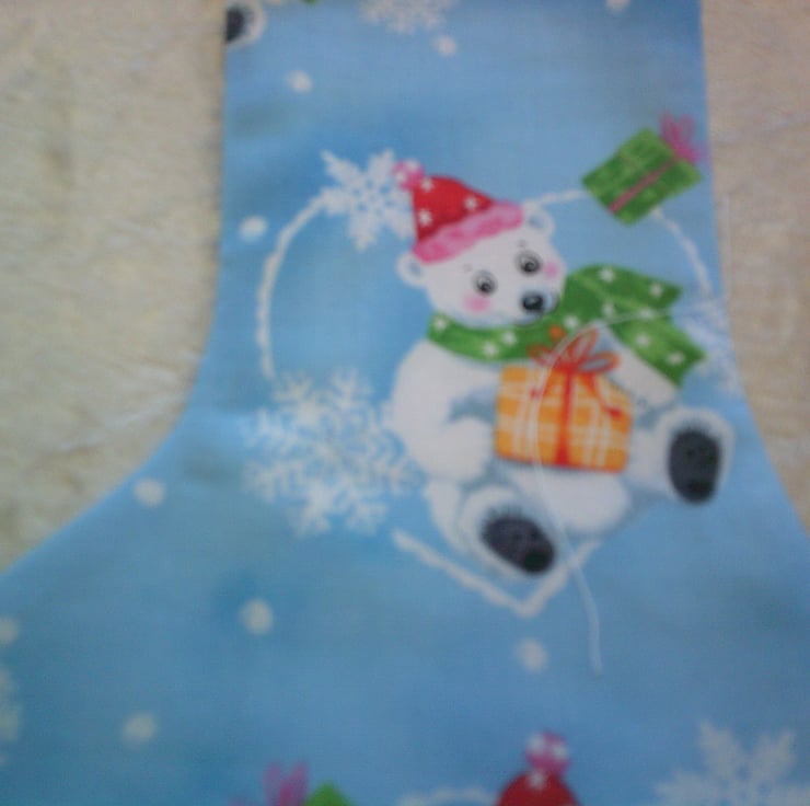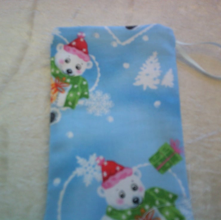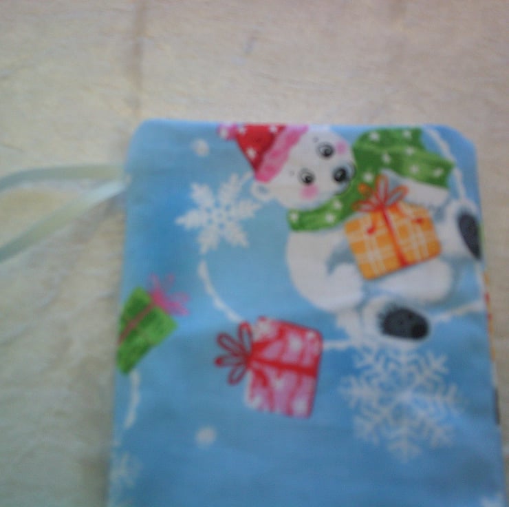 The fabric used is of polar bears in bobble hats holding parcels on a blue background. The reverse side is the same design