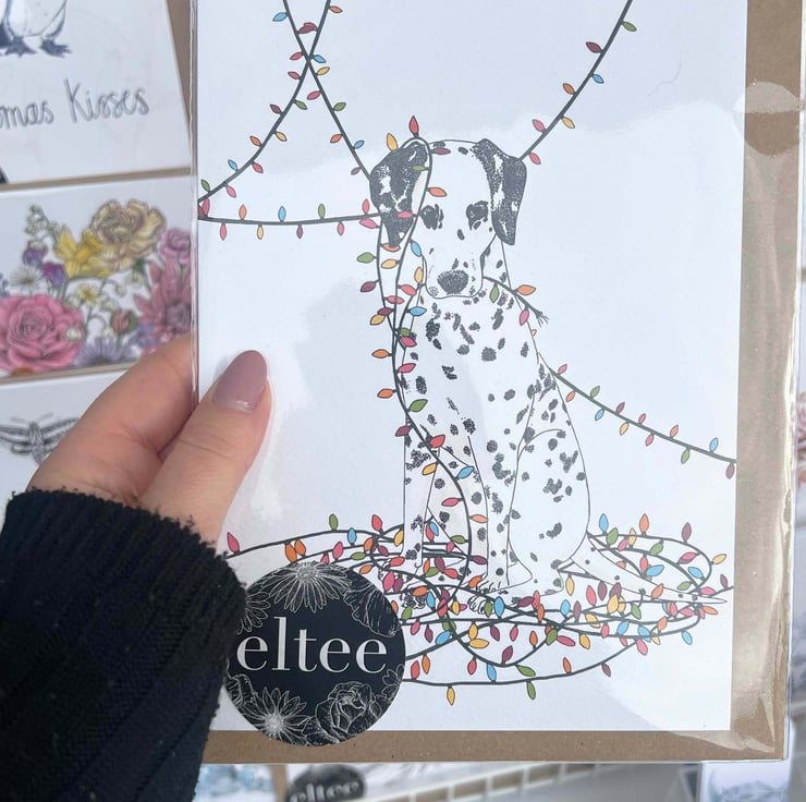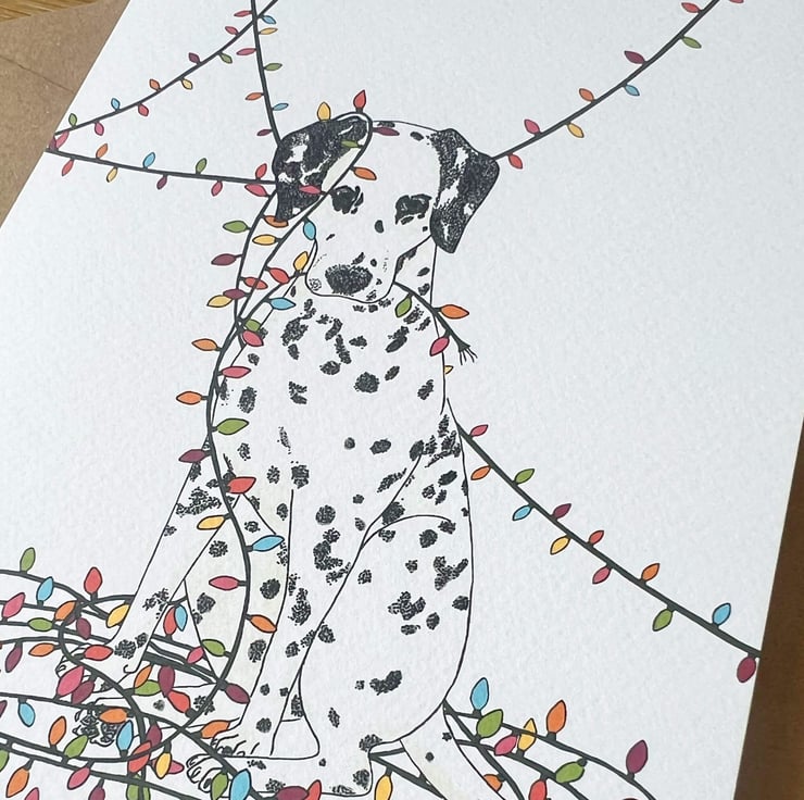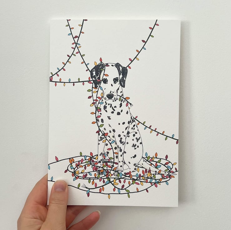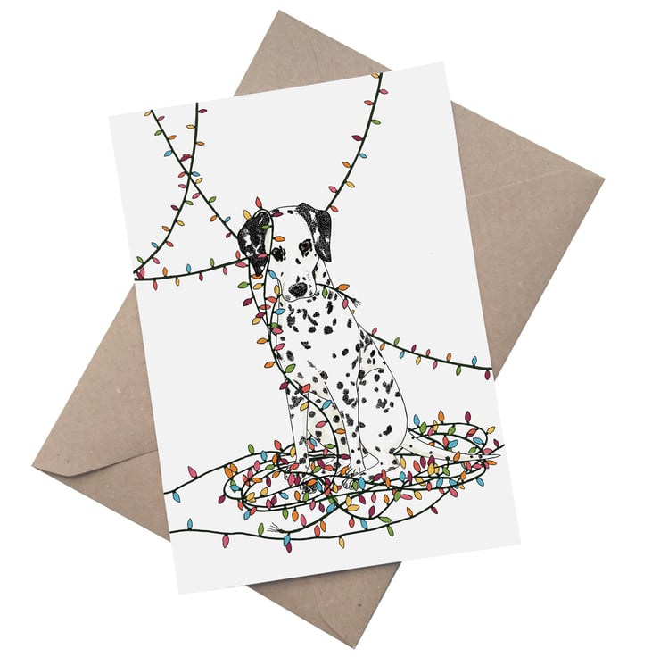 The cutest A5 Christmas card featuring a Dalmatian wrapped in fairylights, based on my own dog, this is a fun, non-traditional Christmas card that will certainly bring some joy.