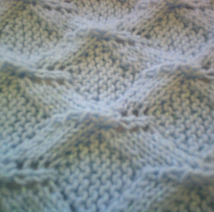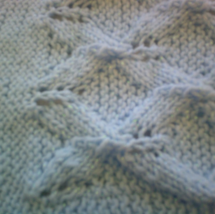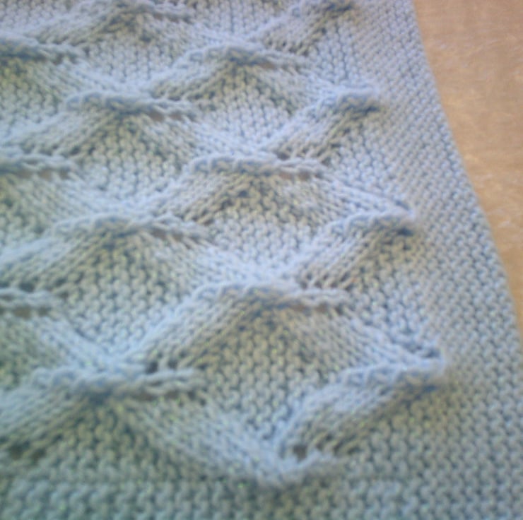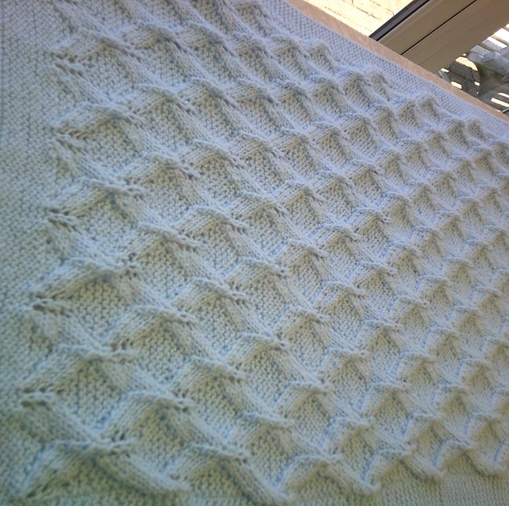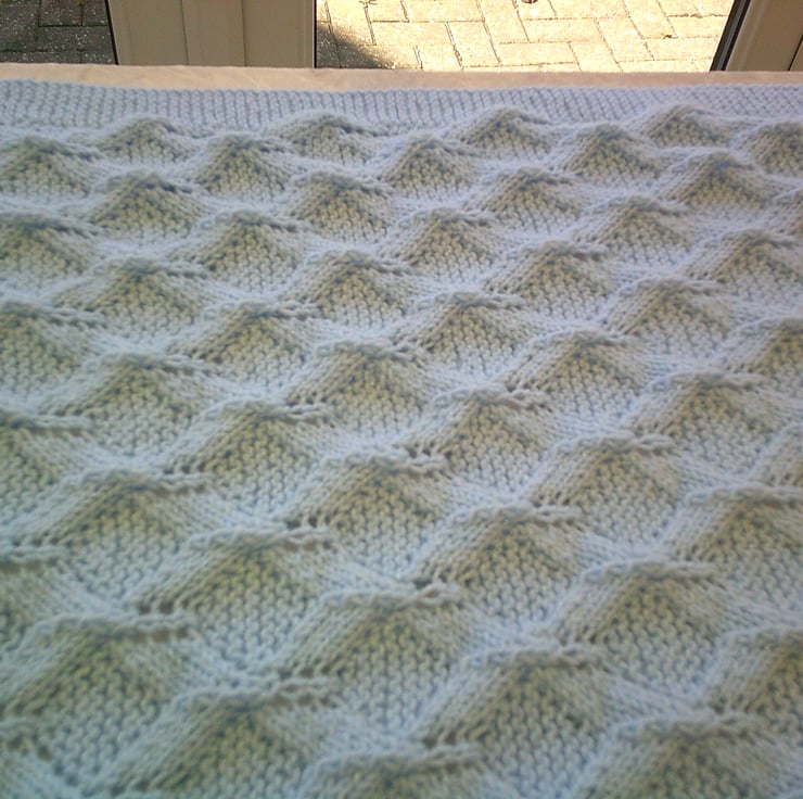 This handed knitted Blue blanket is made using acrylic yarn and has a diamond lacy style design with garter stitch borders. It measures approximately 33 inches x 21.5 inches (84cm x 54cm) and could be used on the pram or even on babies cot.