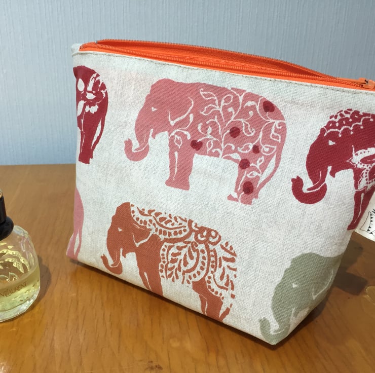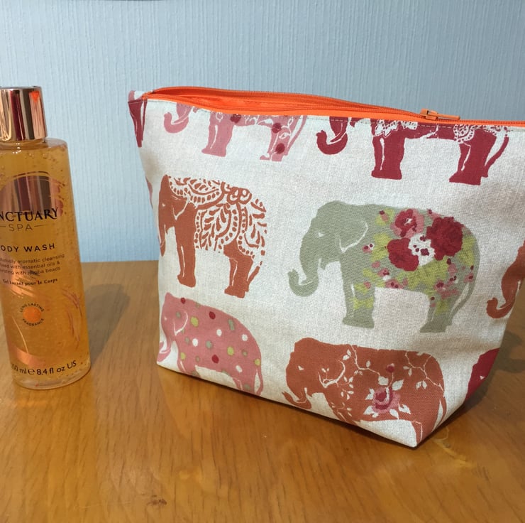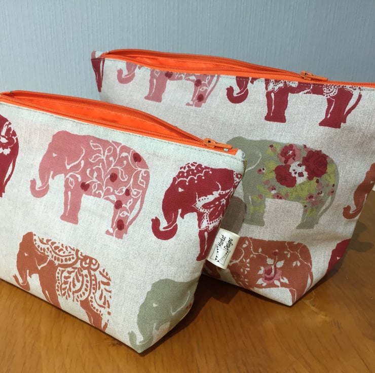 Both bags are made out of this fabulous Clarke & Clarke Elephant heavy cotton fabric and feature an orange waterproof lining and zip. Due to pattern placement, the washbag and makeup bag you receive may not be exactly the same as the ones picture.
