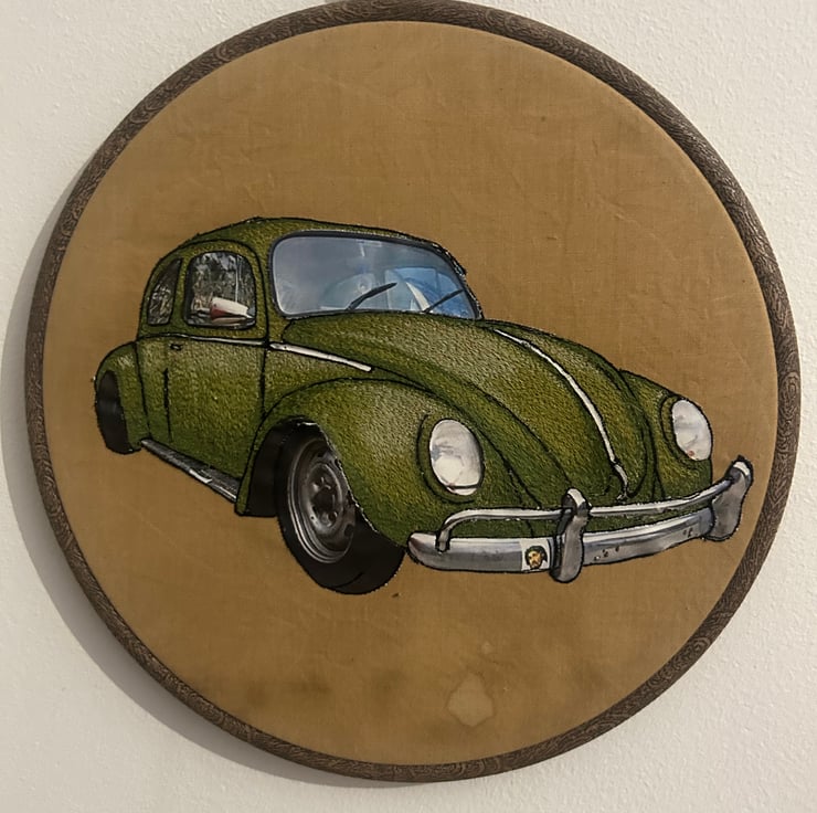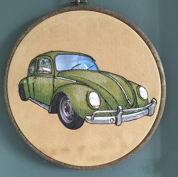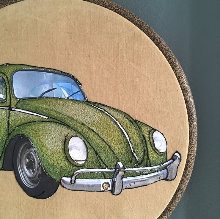 Free hand sewing machine embroidery VW beetle, mix of threads and paper and framed in 12inch flexi hoop, created on cotton coffee stained fabric.