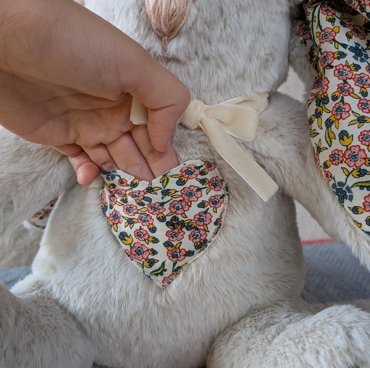 Memory Touch Points – your fabric incorporated into the foot pads and inner ears and HeartPocket™ chest heart – a soft pocket made from your fabric, perfect for a handwritten note, photo, or small keepsake