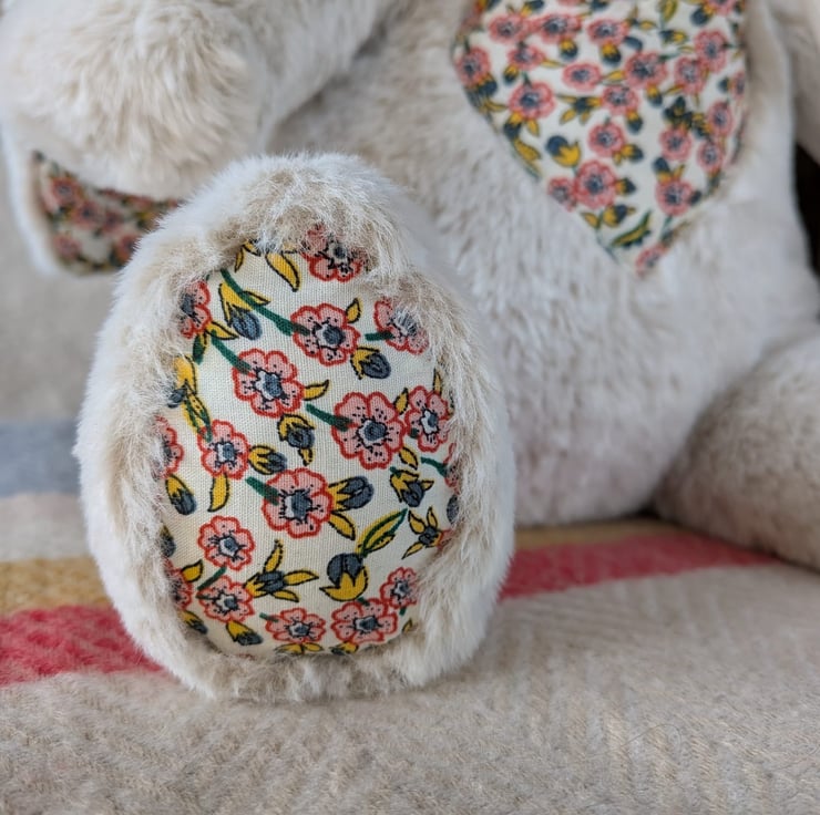 I will craft your rabbit using your fabric for the foot pads, inner ears, and HeartPocket™. If you are sending multiple different pieces of fabric. Please do let me know if you would like a particular fabric on the ears or pocket for example.