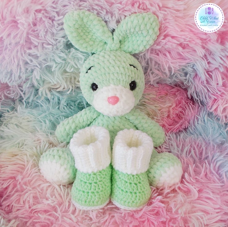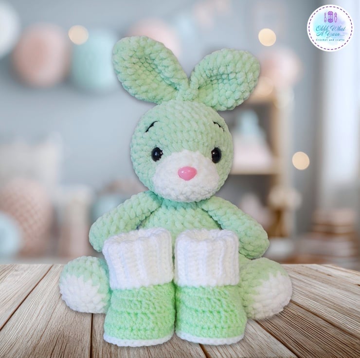 Bunny would make a perfect new baby gift, and I have made some optional matching age 0-3 months ribbed cuff boots. The boots are crocheted with acrylic yarn and are hand or machine washable at 30 degrees, do not tumble dry. (See drop down menu for purchase options)