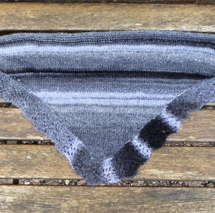 Stripy hand knitted mixed wool 53%/ acrylic 47% fibre cosy triangular neck and shoulder warmer for cooler days. Fits all sizes. Loop over ends and tie at front and can be secured with a scarf/shawl pin.