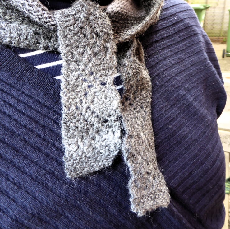 I love to have a knitting project in the winter. I hope you enjoy being warm, relaxed and cosy with my triangular scarf/shawlette. You can also use one of my felted scarf/shawl pins to secure the tie.