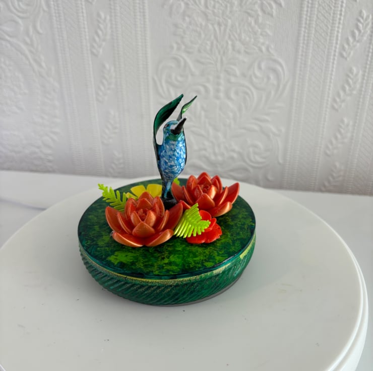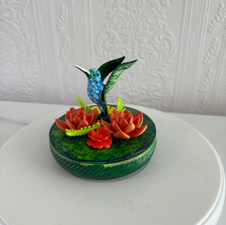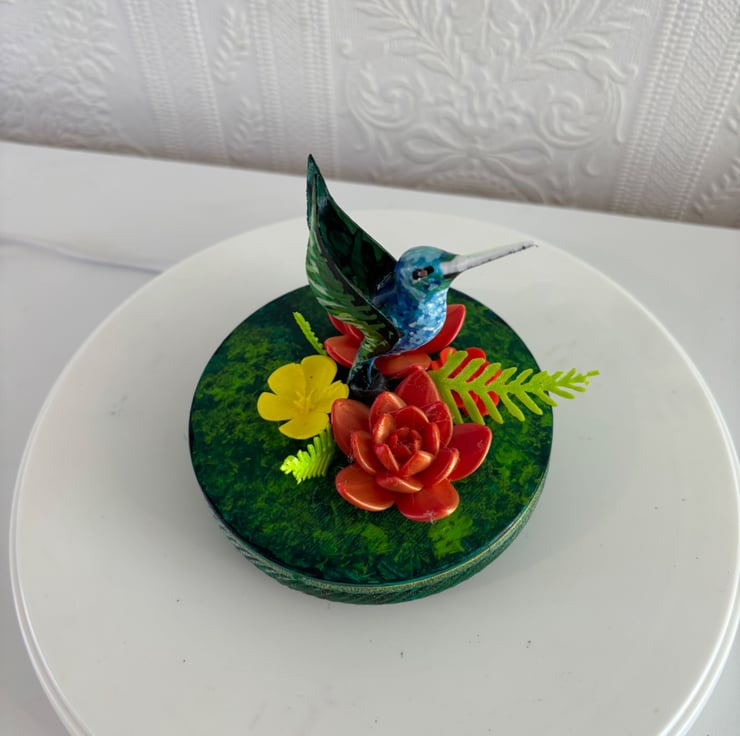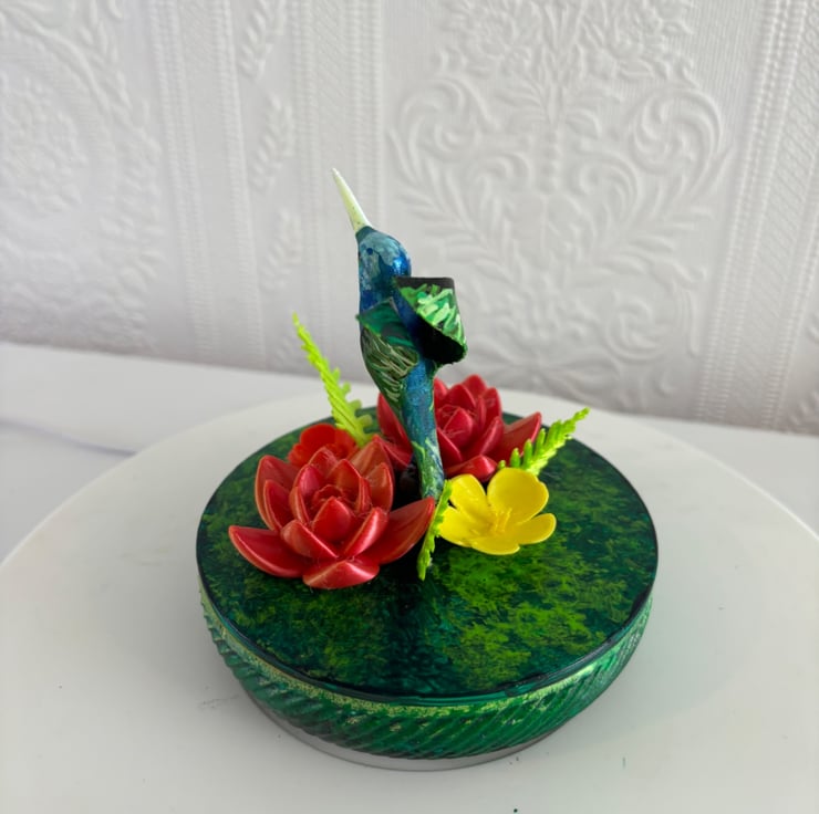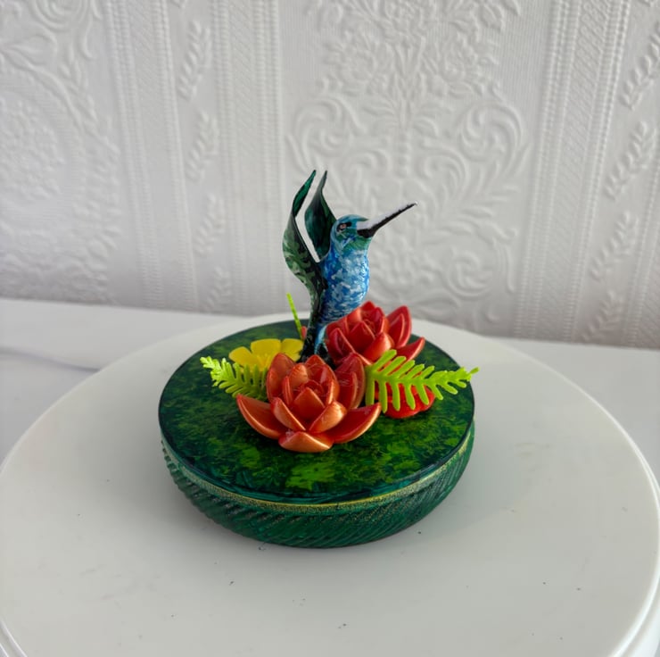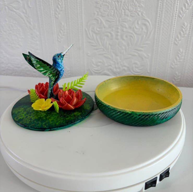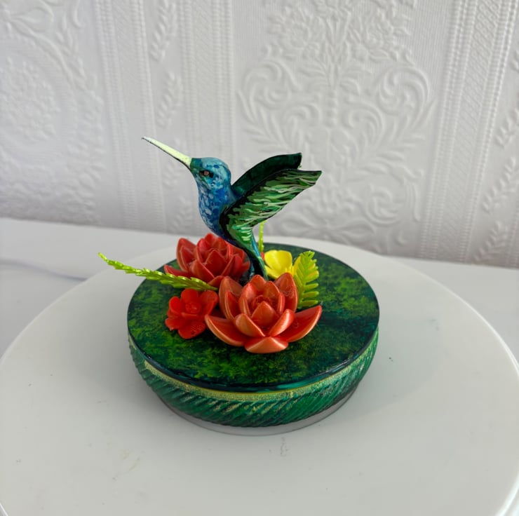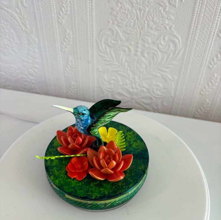 A hand painted and sealed Hummingbird bowl with lid by Andrew Jenkins