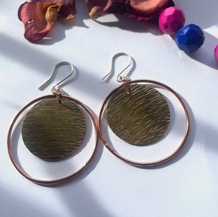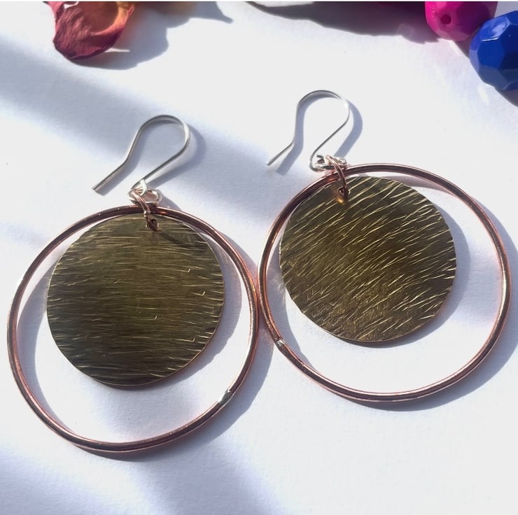 I made these for fun, and they really are fun. They are made with brass and copper and sterling silver (for the ear wires). The are cut, hammered, and forged completely by hand. This makes them unique, exclusive, and a little but wild. The copper and brass will need to be regularly polished but that is quite simple to do. Store them in a dry place - plastic bags work well, or a cloth. The outer circle is 4cm diameter and the inner brass disc is 3cm. Delivered in a black box.