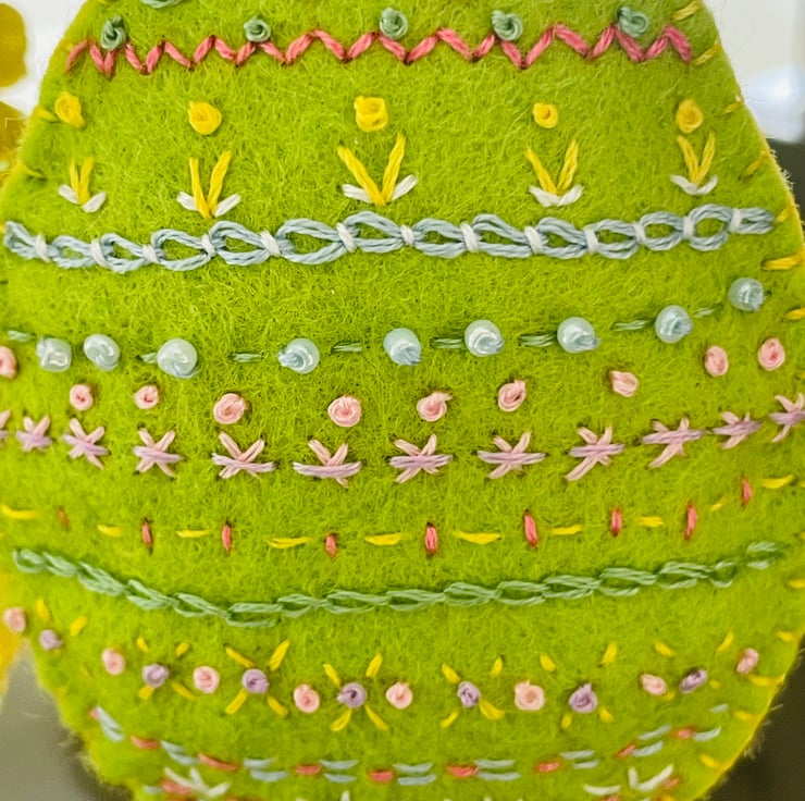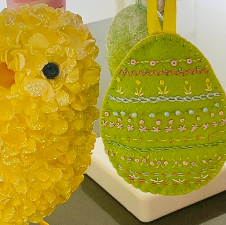This hand embroidered felt egg will look great hung from any Easter tree. Approximately 9cm in length with a lemon satin ribbon hanging hoop approximately 7cm in length. The egg has been embellished with tiny seed beads and is entirely hand sewn. Lightly filled with toy filling, this felt egg is for home decor use and not intended as a toy.