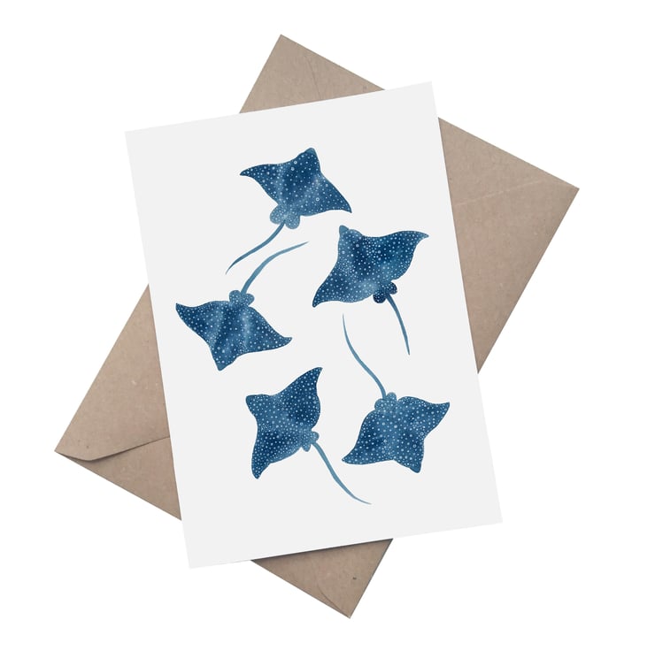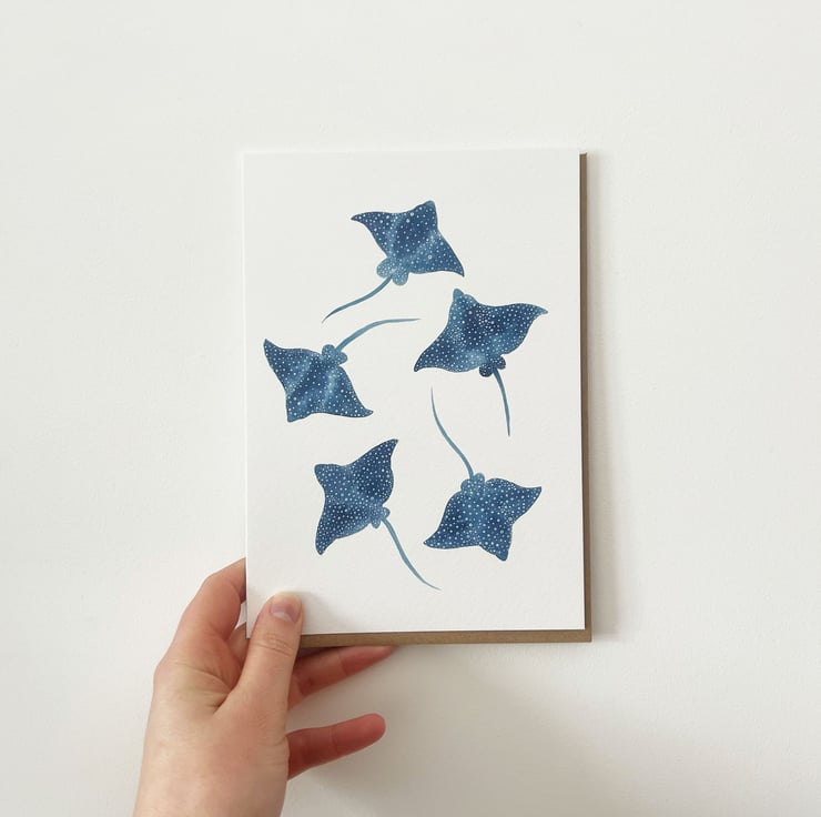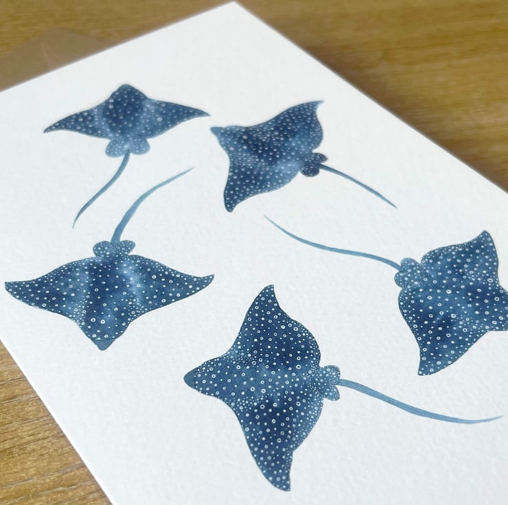 An A5 greetings card of my watercolour Spotted Eagle Ray design, featuring five Rays hand painted using vibrant Brusho inks and finished using digital techniques