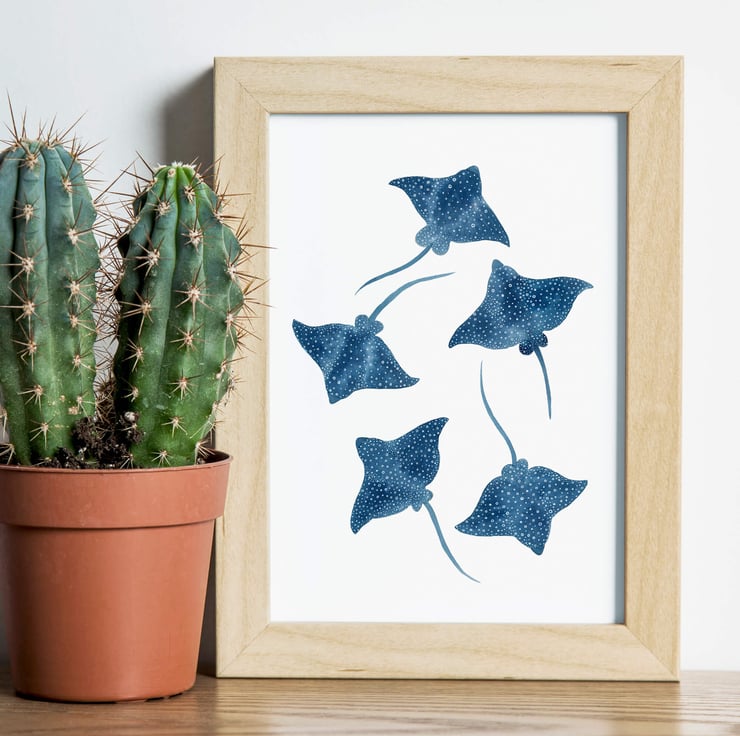Inspired from my original Whale Shark paintings I chose to explore ways of creating new sea creatures to fit within a collection. I chose to create these Spotted Eagle Rays using a mixture of Brusho pigment inks and Procreate to add the final touches. I wanted the spots to be delicate and wouldn't have been able to achieve the same result had I hand painted the whole thing. I hope you love the final result as much as I do.