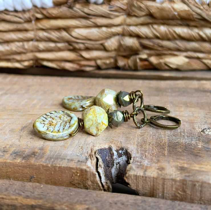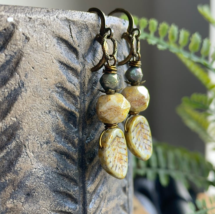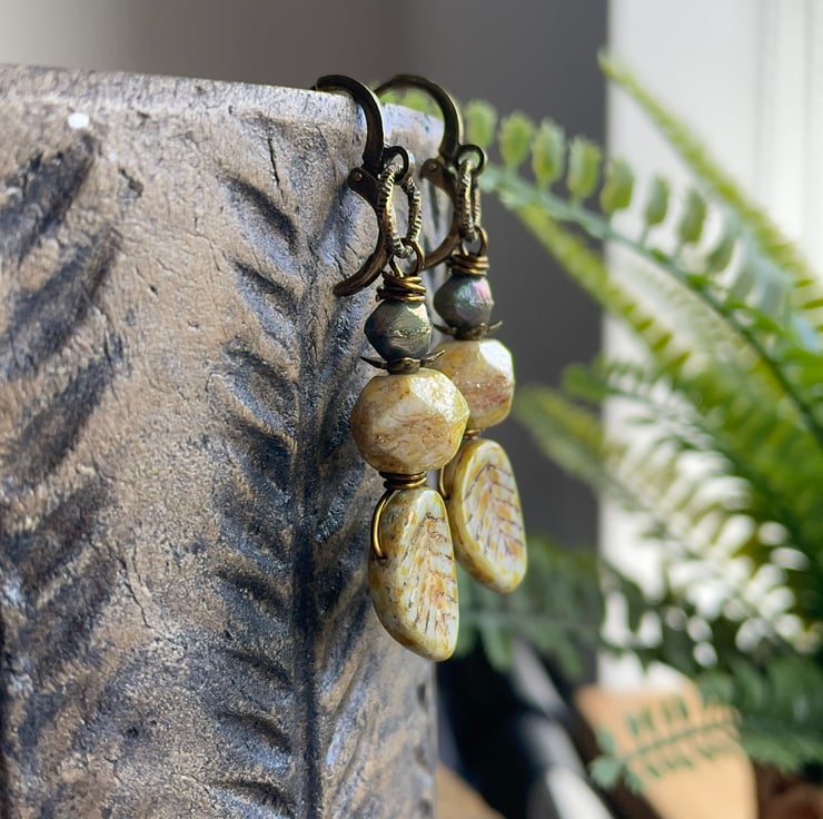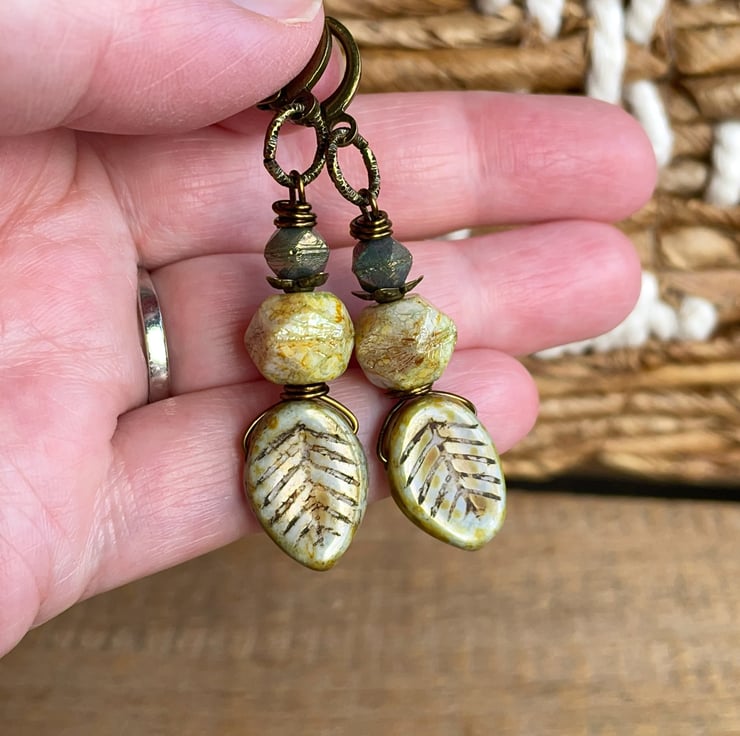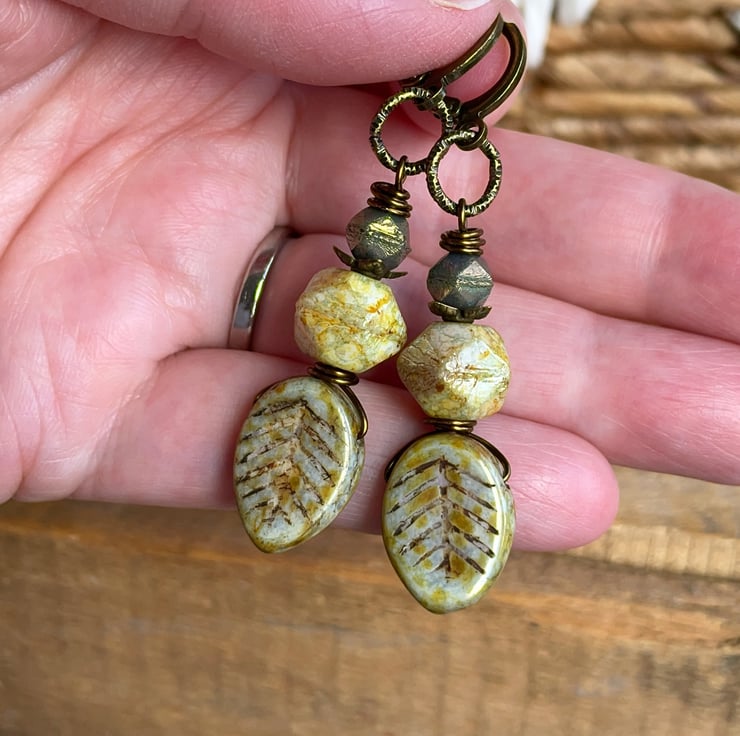 These nature-inspired earrings feature beautiful Czech glass leaf beads in soft shades of sage green, finished with a rustic Picasso wash that highlights their carved veins.