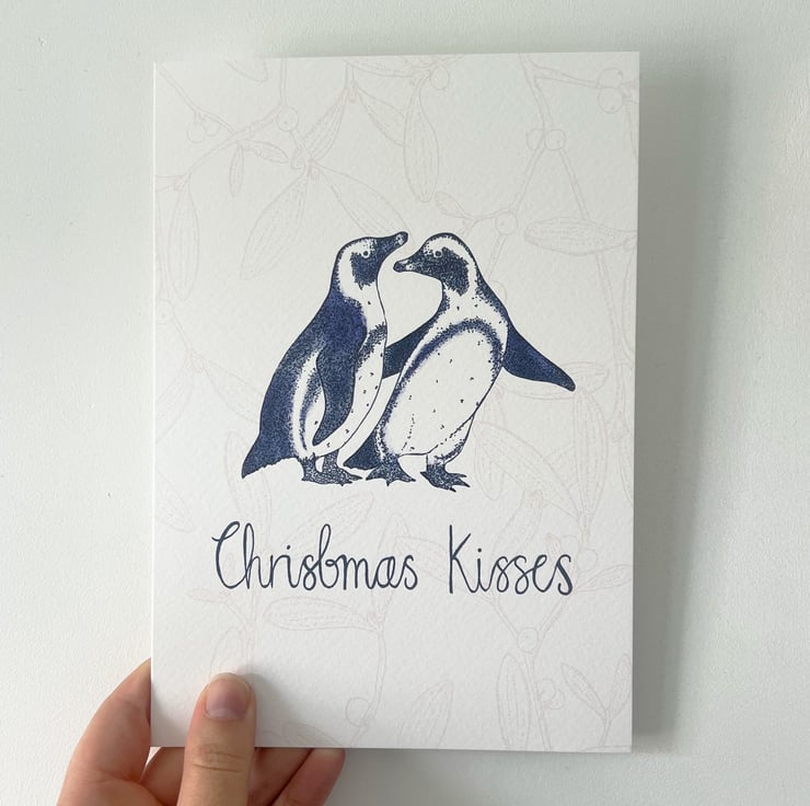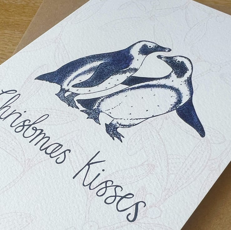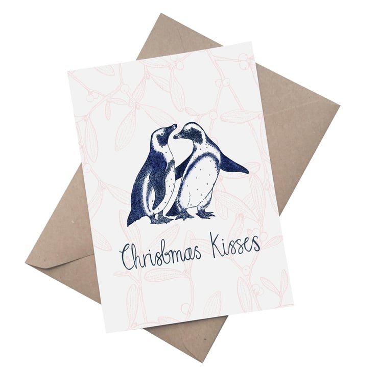 A perfectly romantic A5 Christmas card featuring a sweet little Penguin couple with the message 'Christmas Kisses', against a backdrop of mistletoe. A perfect Christmas card to gift to your loved ones.