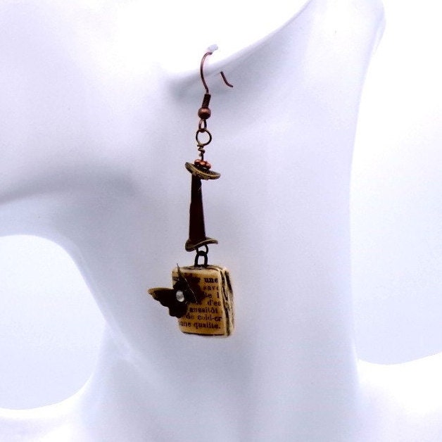Copper Dangle Earrings- Artisan Ceramic Book- Copper Butterfly With Crystal- Twisted Copper Tubes- Copper Flower Spacers- Copper Ear Wires