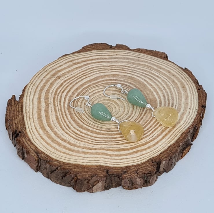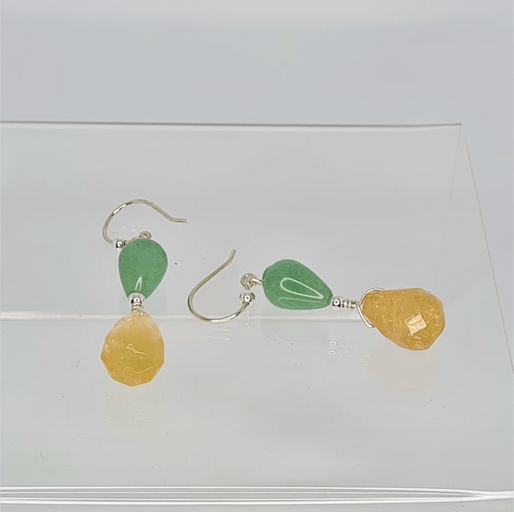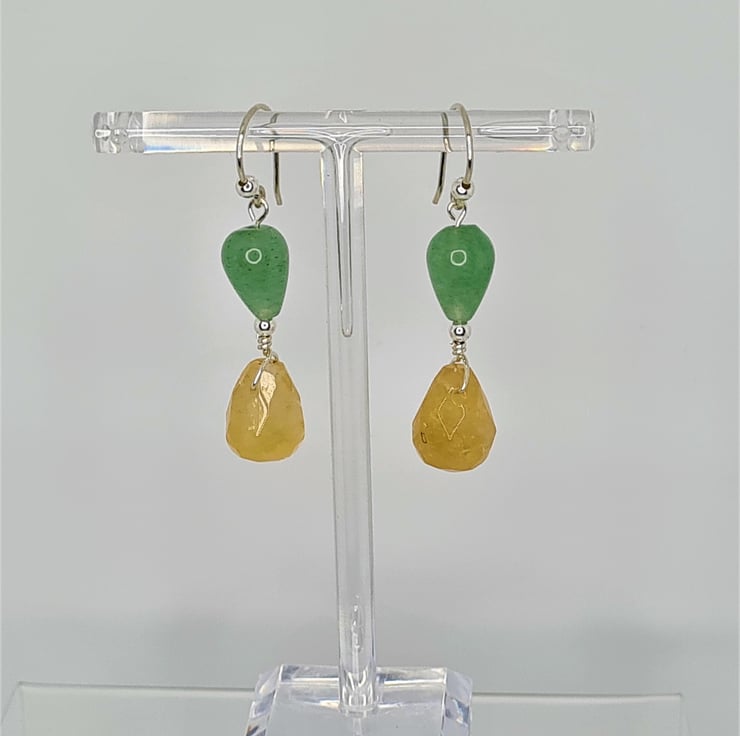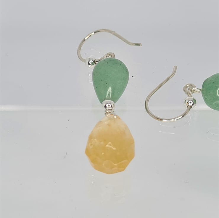 Handmade Sterling Silver Dangle Drop Earrings With Green Aventurine And Citrine Gemstones. A green Aventurine Pear drop Gemstone Coupled With A 14x10mm Citrine Faceted Teardrop Briolette. 3mm Sterling Silver Ball Spacer All Hung On 22 Gauge Sterling Silver Wire Beneath A Handmade 22 Gauge 0.8mm Sterling Silver Ear wire.