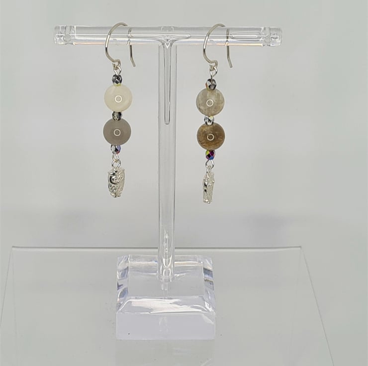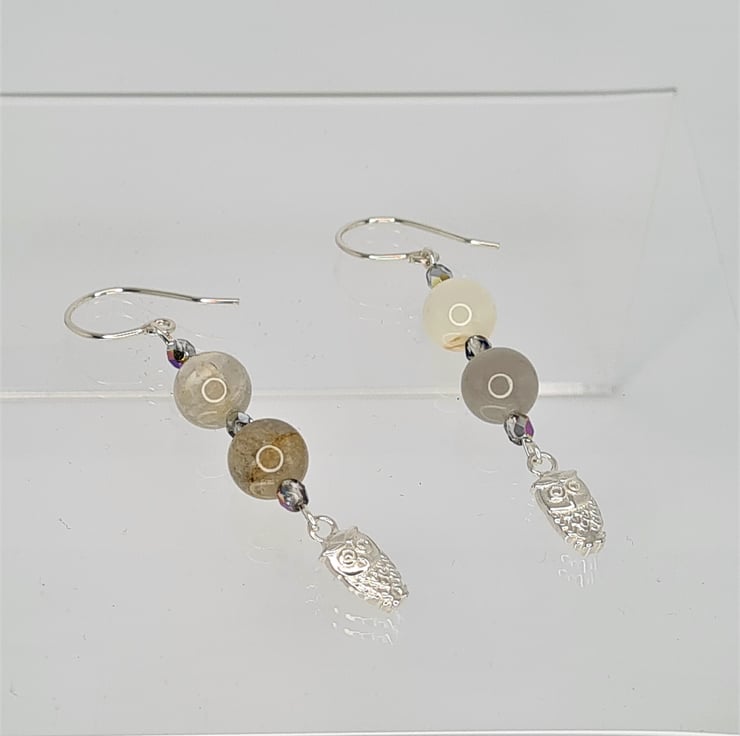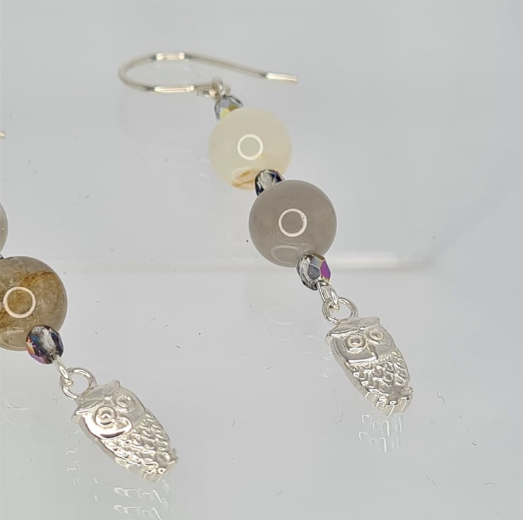 Sterling Silver Owl Dangle Drop Earrings. A Double Sided Sterling Silver 9mm Owl Beneath A Pair Of Peach Moonstone 8mm AB Grade Gemstone Beads. They Are Hanging From Handmade 20 Gauge 0.8mm Sterling Silver Ear Wires And Decorated With 3mm Fire Polished Czech Glass Beads. The Earrings Have A Drop Length Of 55mm And Are 40mm Long From The Bottom Of The Ear Wires.