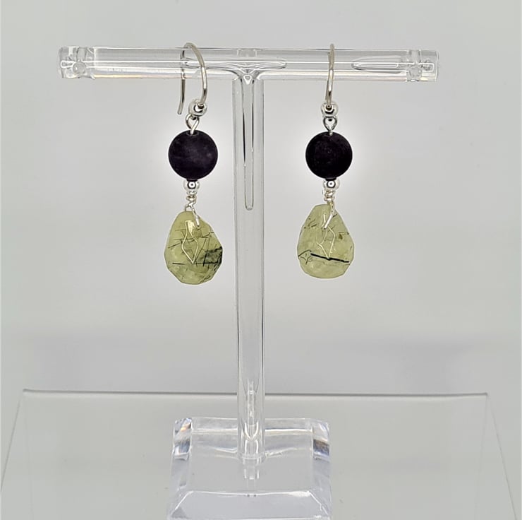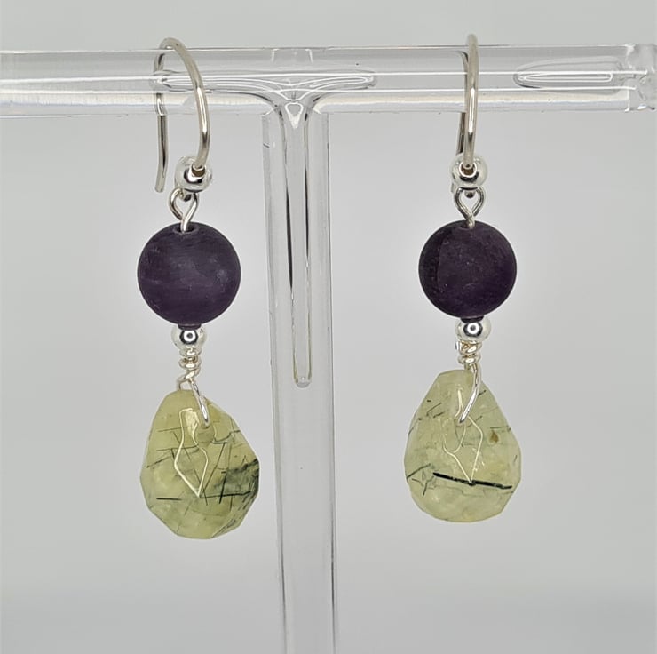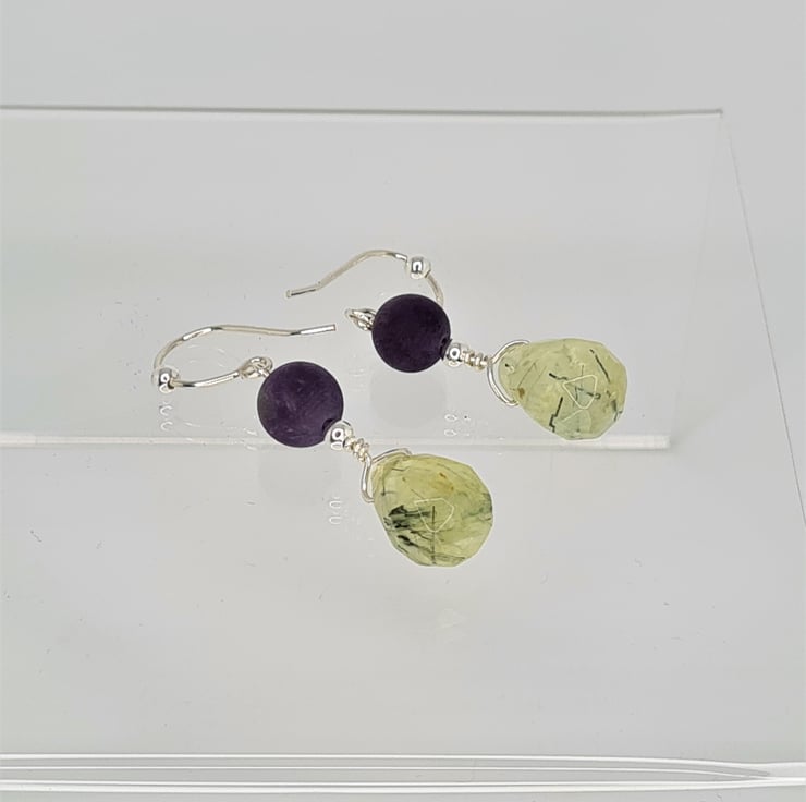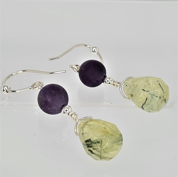 Amethyst And Prehnite Gemstone With Sterling Silver Dangle Drop Earrings. A 14X10mm Prehnite Faceted Teardrop Briolette, 8mm Matte AB Grade Gemstone Bead, 3mm Silver Ball Spacer Hanging On 22 Gauge Sterling Silver Wire. All Hanging On A 20 Gauge 0.8mm Handmade Sterling Silver Ear Wire.