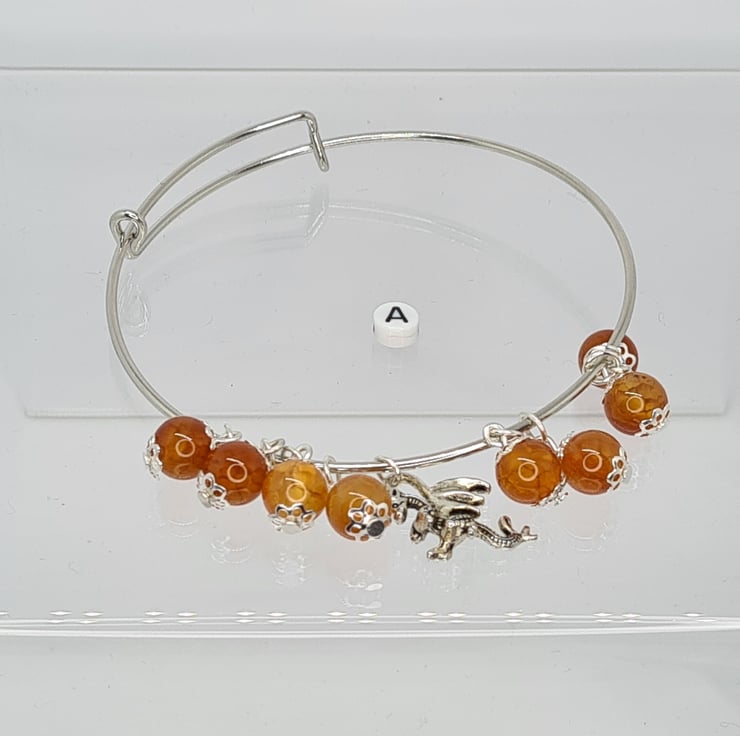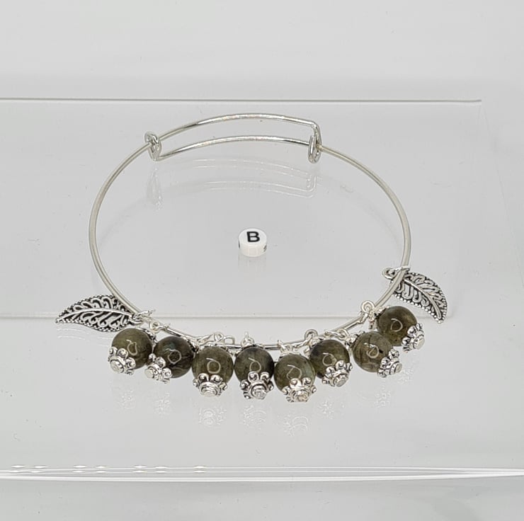 Handmade Gemstone Adjustable Bangles. One Bangle Has 8mm Natural Fire Crackle Agate Which Has Been Polished, Dyed And Heated, With A Small Silver Metal Dragon. The Other Bangle Has 8mm Labradorite Spectrolite Natural Gemstones AB Grade. It has Tibetan Silver Decorative Bead Caps And Silver Filigree Leaves. The Bangles Are 6cm Across When Closed But Are Fully Adjustable.