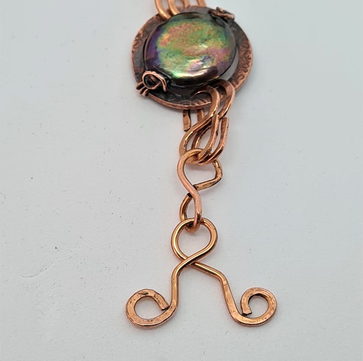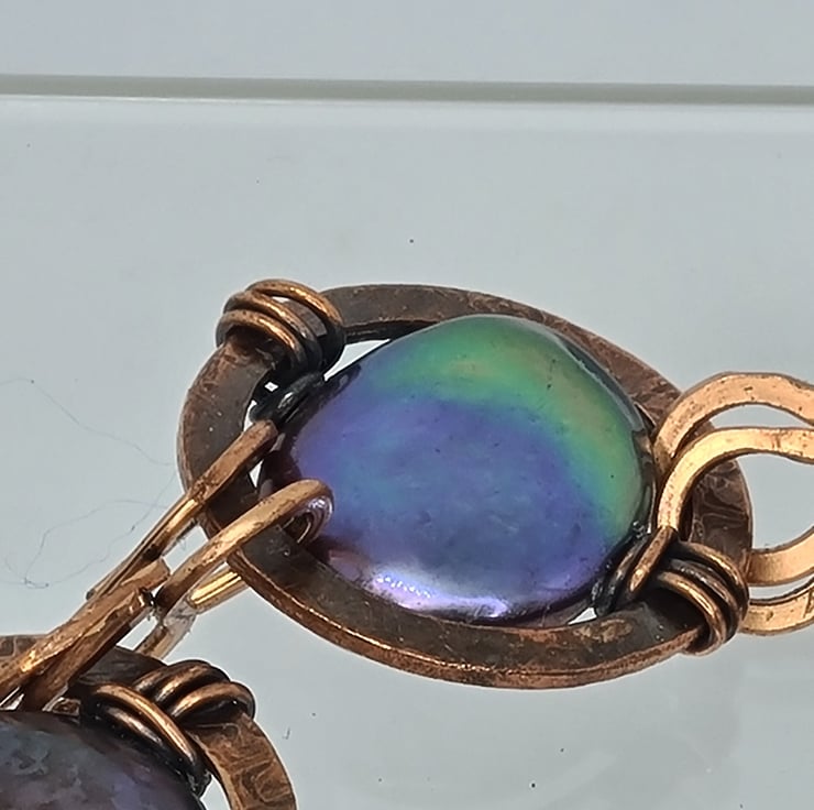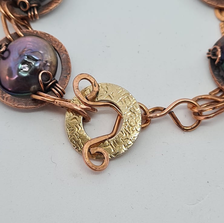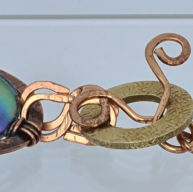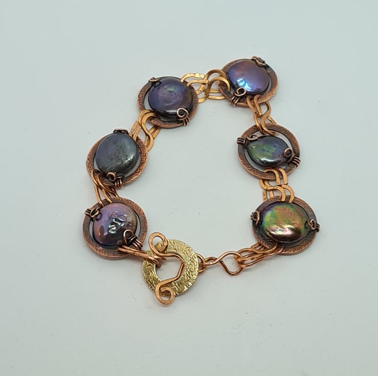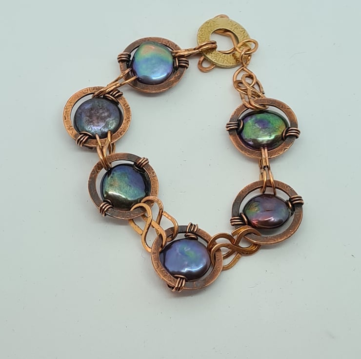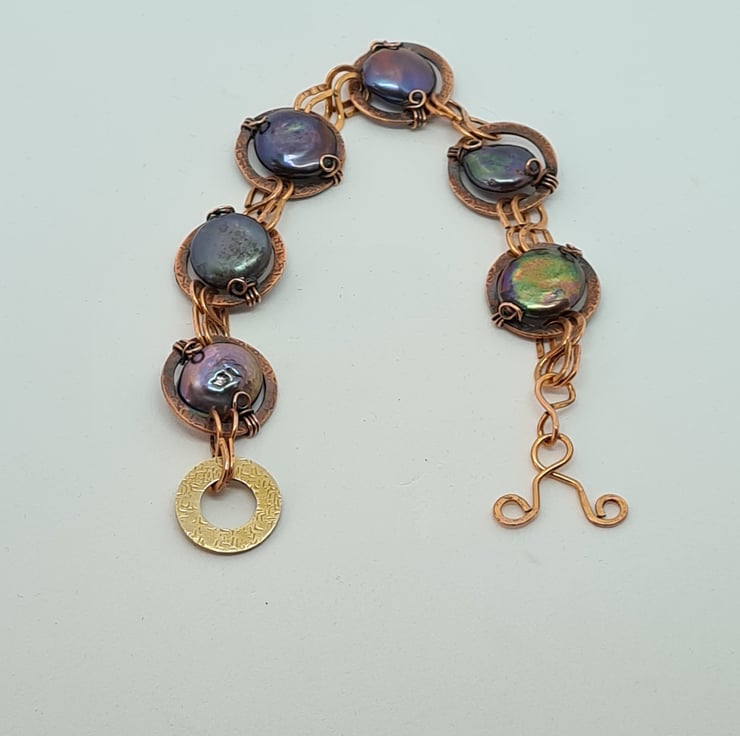 Here we have a handmade handcrafted Artisan bracelet. It is 20cms long and weighs in at 22 grams. I have hand textured copper and brass washers which are linked together with handmade copper textured links. The washers have a central black purple coin purple held in with copper handwired decoration. It has been finished off with a handmade toggle clasp with a textured finish. Finally I have given it an antique patina which I have then polished to give it a classic antique look.