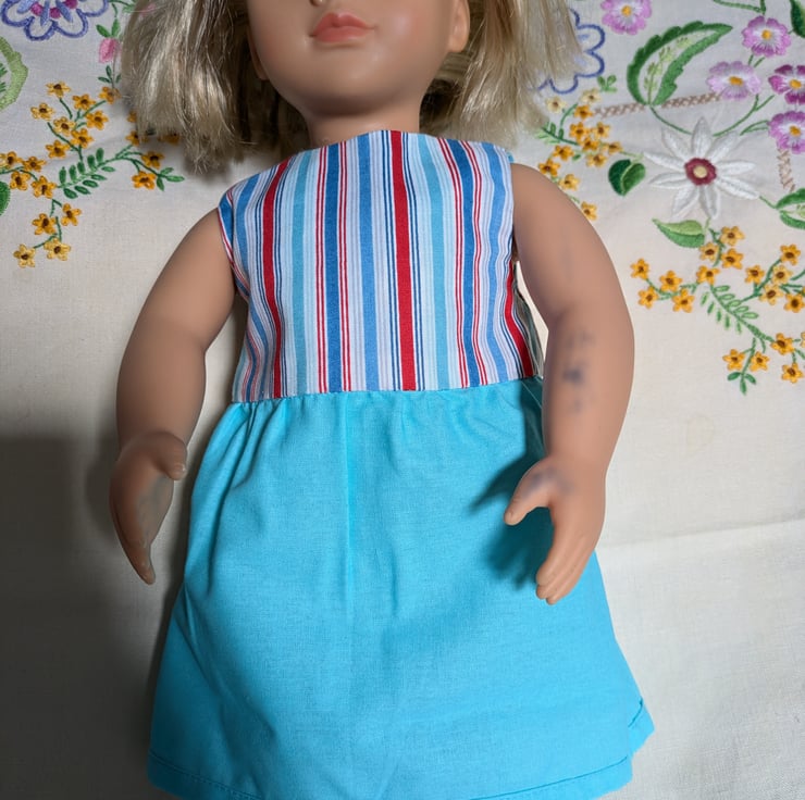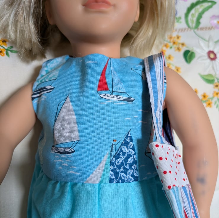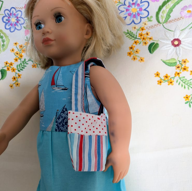 This Our Generation Dolls Dress is super cute. It is fully reversible, with one side featuring a striped bodice and a blue skirt, and the other a boats-on-water seascape. It comes with a little bag with two pockets.