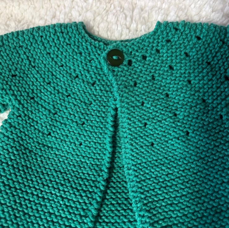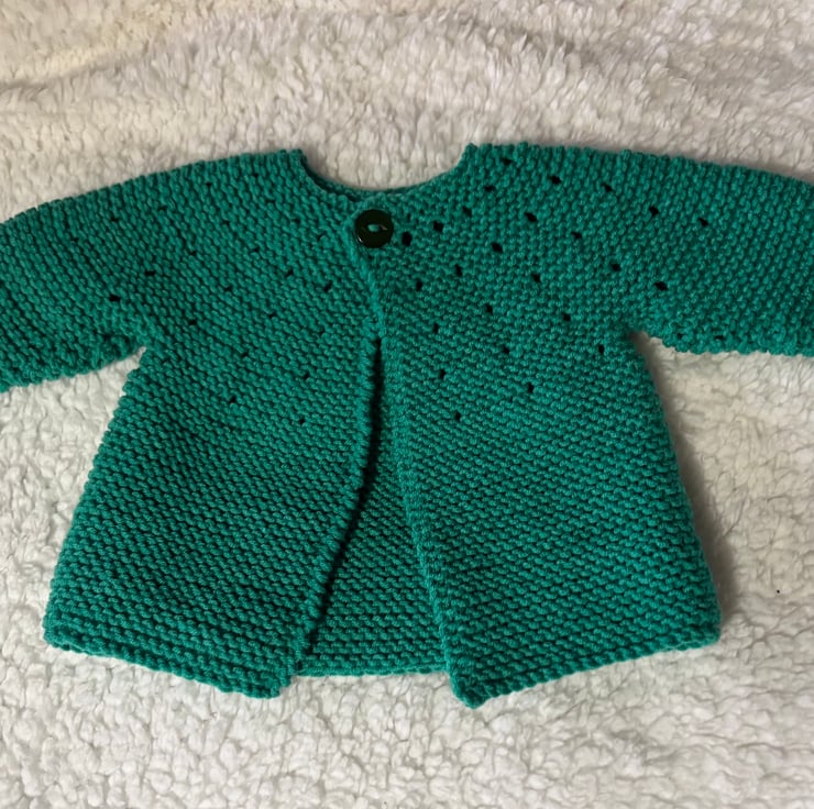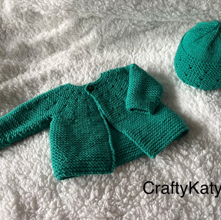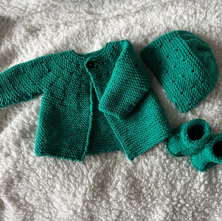 Includes cardigan, hat & matching bootees.