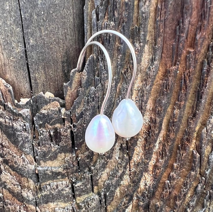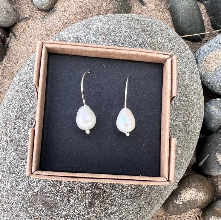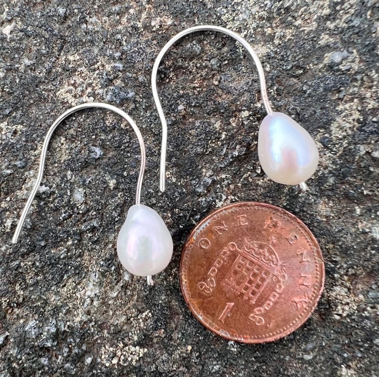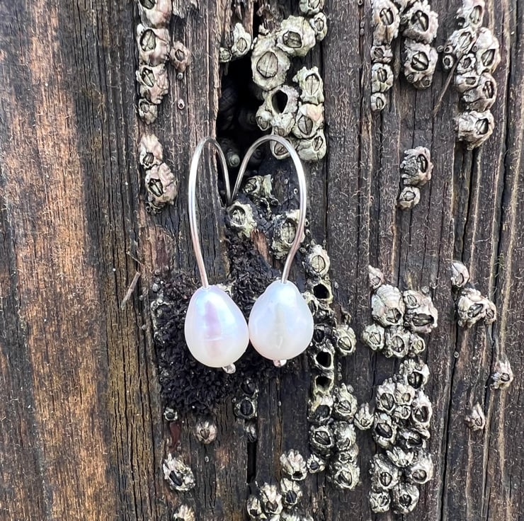 Earrings made from eco sterling silver 0.7mm wire, with a large good quality freshwater pearl designed to hang just off the earlobe. Simple, contemporary and elegant pearl earrings. The freshwater pearls are quite large at approx 6mm in diameter and approx 9mm long. The total dangle is short at about 25mm/ 1 inch.