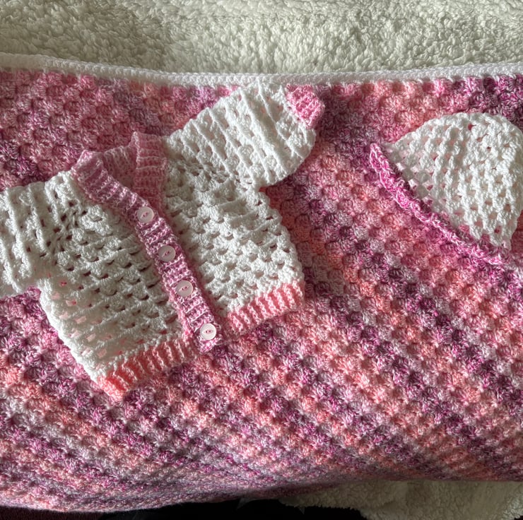 The corner-2-corner blanket is an absolute delight to make. I was thrilled when I came across the patterns for the cardigan and hat. They all make a perfect match