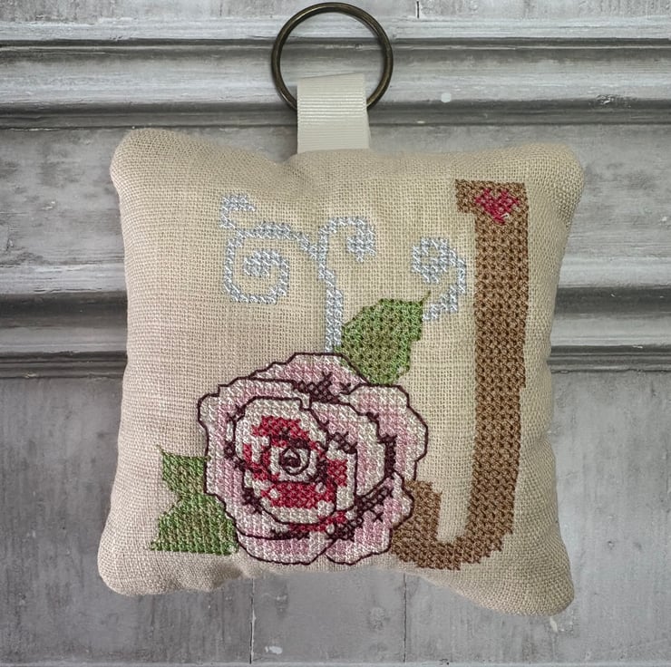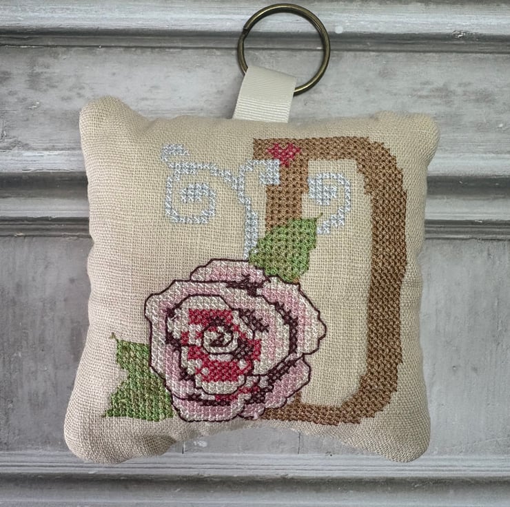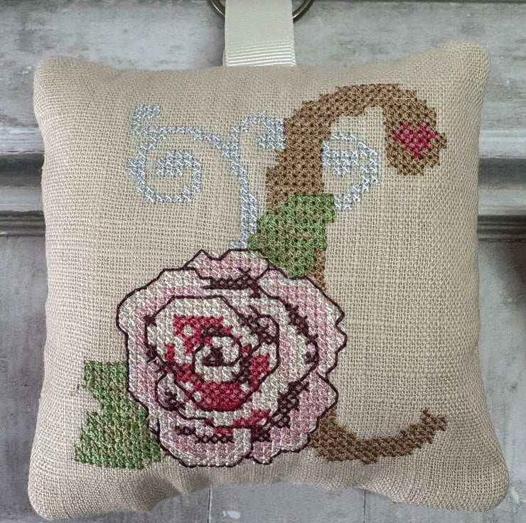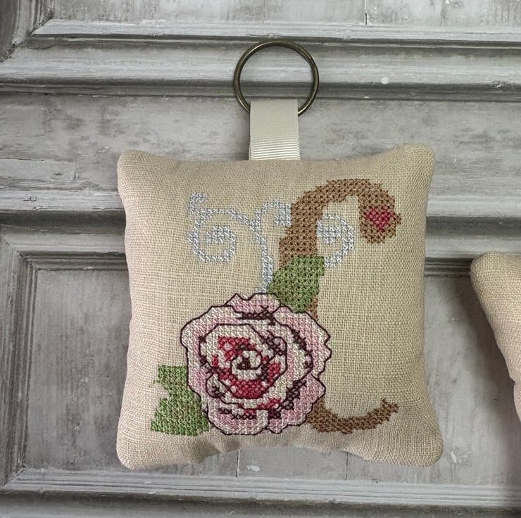 Little pillows personalised with an Initial in a Cross Stith and Rose design. Stitched onto 'Sandshell' Pre-Washed linen, the back is also in linen but with a diamond quilted design.