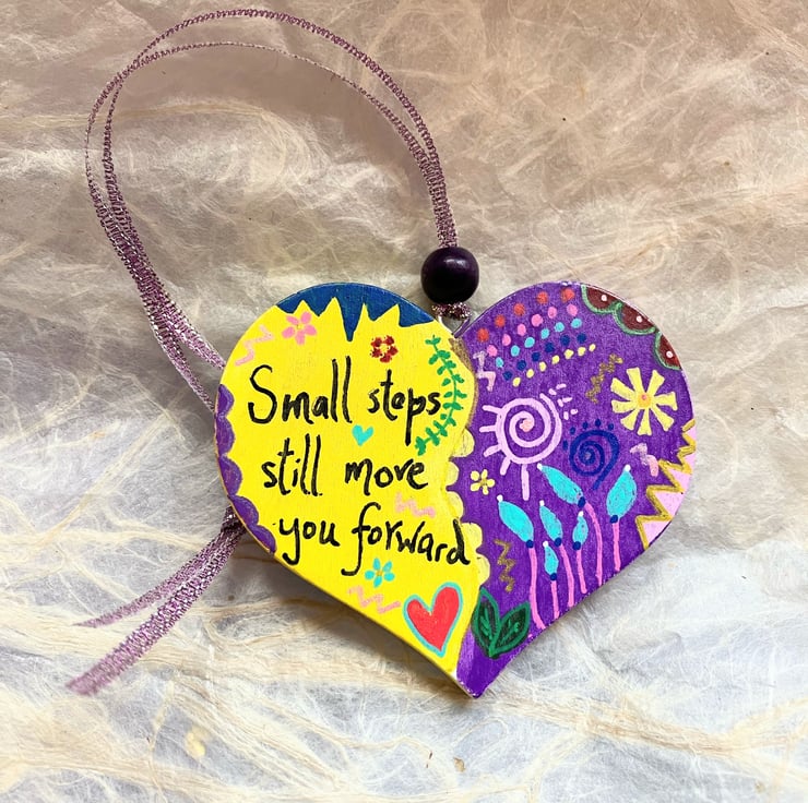 This inspirational wooden heart has been hand painted with cheerful colours. The words Small steps still move you forward have been hand written on both sides. it hangs by a purple and silver ribbon with a purple wooden bead.