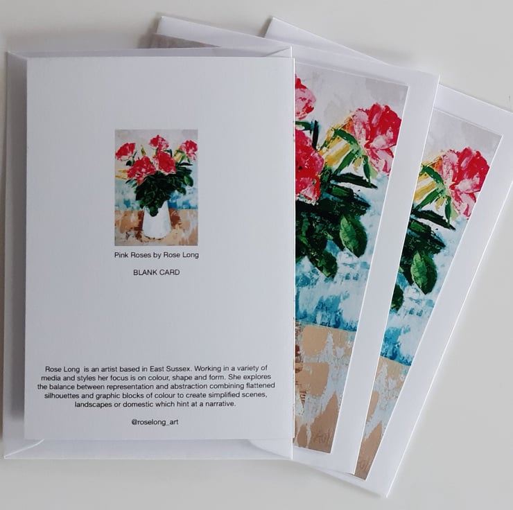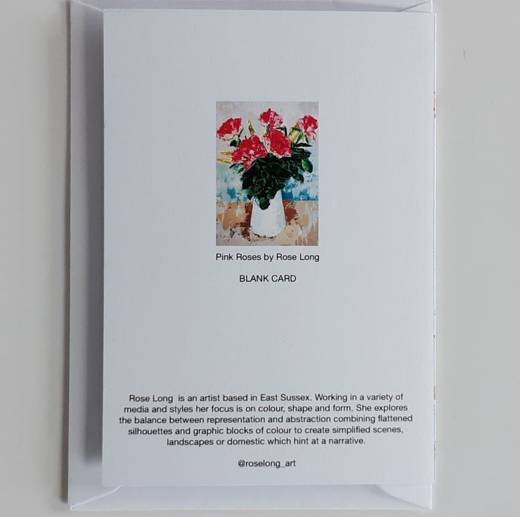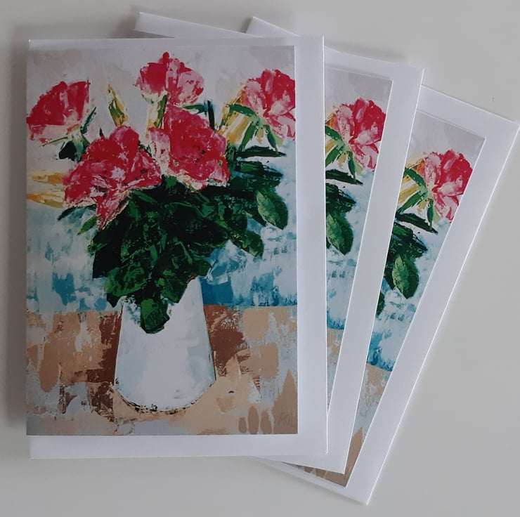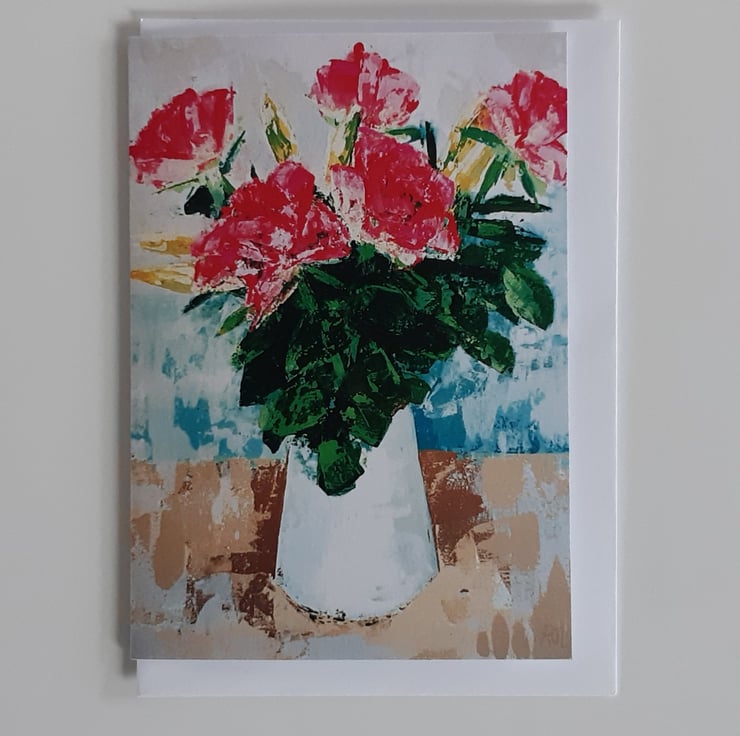 A greeting card reproduction of an original still-life painting. The painting of a bunch of roses in a white jug was painted in emulsion paint tester pot colours using a palette knife1 to create texture.