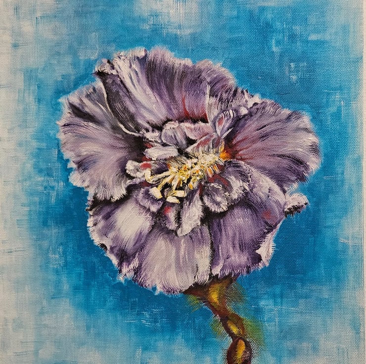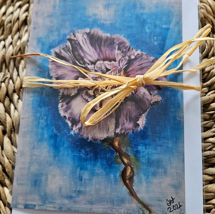 Purple Bloom greeting Card 6 x 4" From Original oil and acrylic Painting. Blank Inside. The modern design and floral theme make it suitable for any occasion. Add a touch of elegance to your greeting with this lovely card that is sure to brighten anyone's day. Printed on quality silk coated 350gsm card with white envelope in cello bag. Blank inside for your own message. Gift ready, mini piece of Art. A bloom that lasts forever!