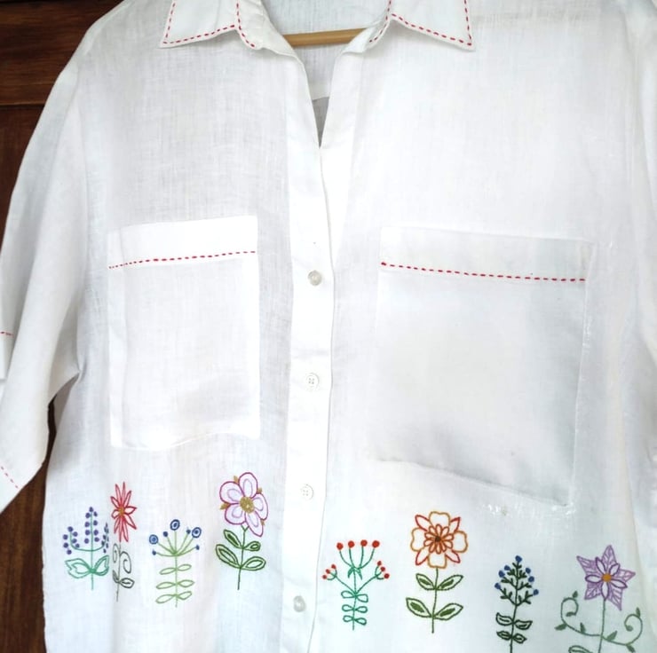 A lovely cool, loose fitting linen blouse with colourful Scandinavian flower designs - hand embroidered.
