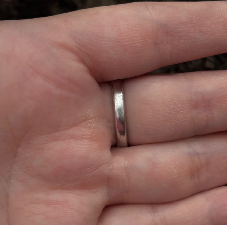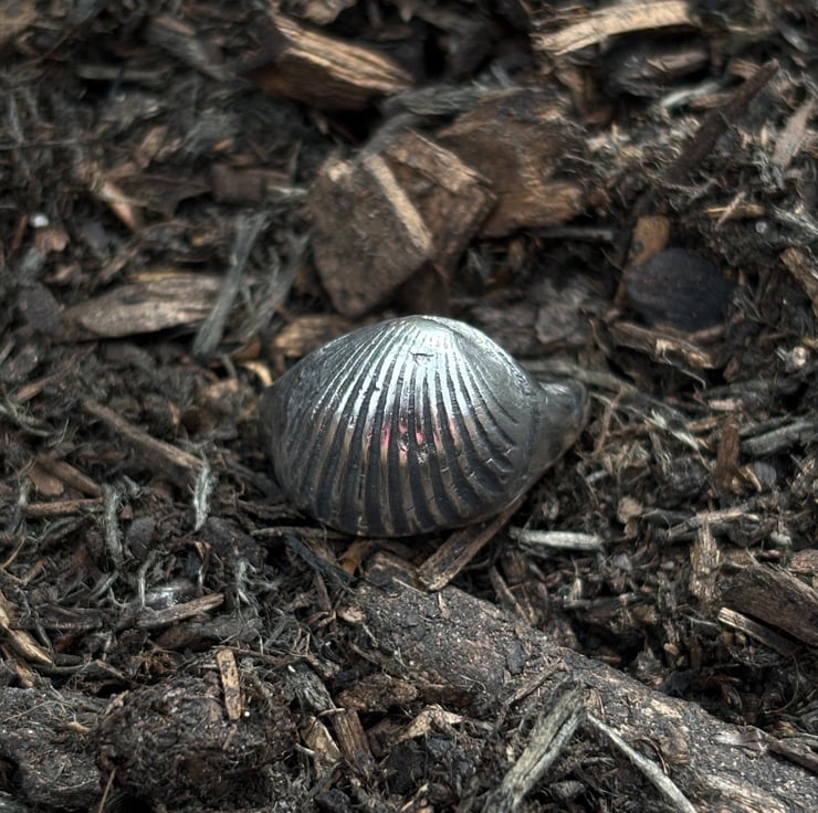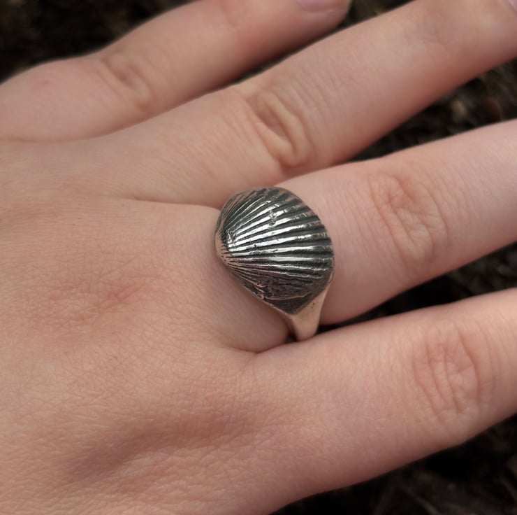 A solid silver signet ring featuring a seashell found on a beach locally. This ring sits quite high off the finger.
