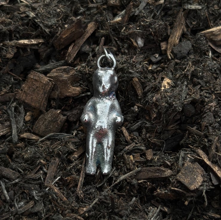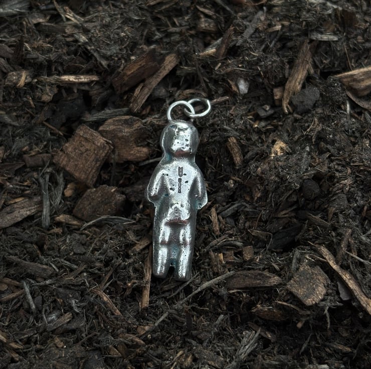 A solid sterling silver cast of a Victorian Frozen Charlotte doll. This pendant is solid and quite heavy.