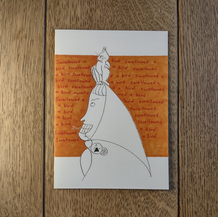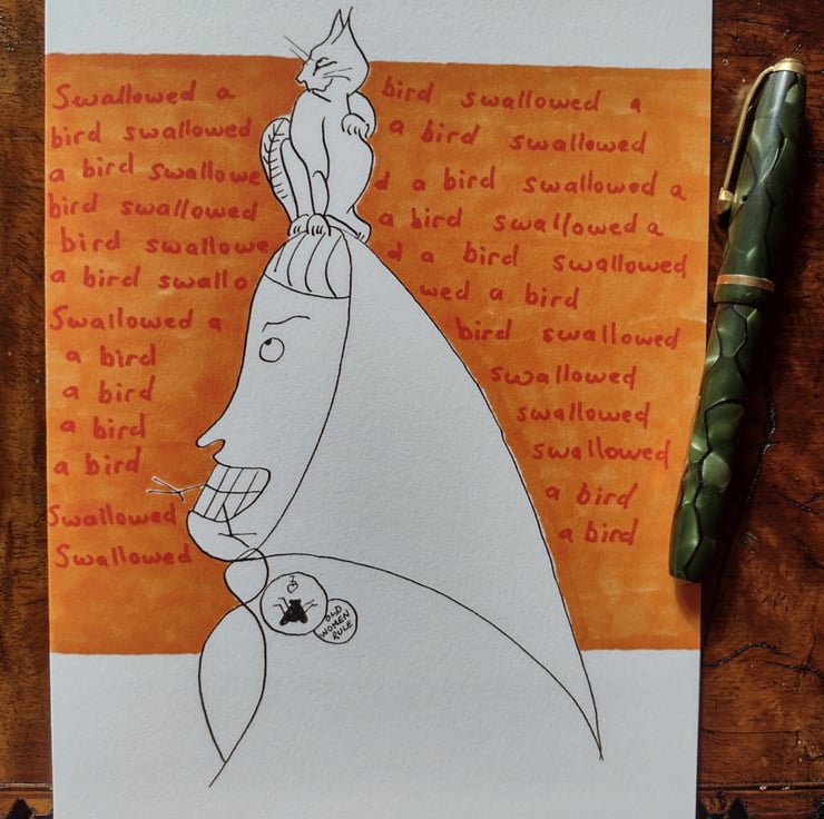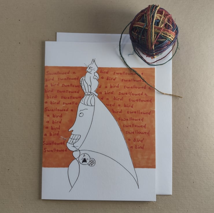 As the background writing shows, this old woman has swallowed a bird.