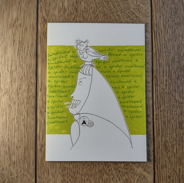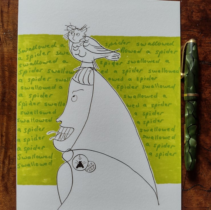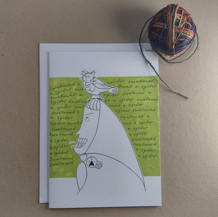 As the background writing shows, this old woman has swallowed a spider.
