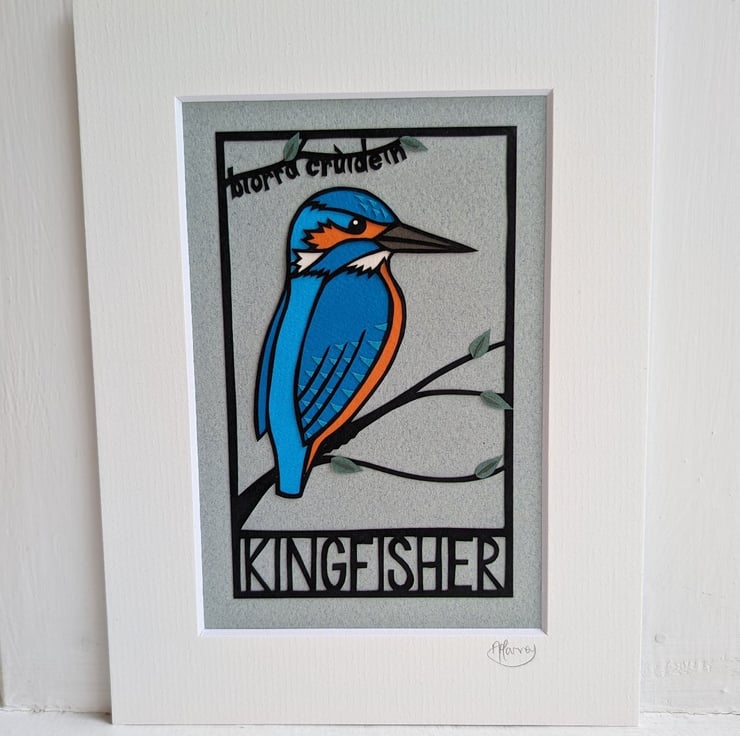 A handmade papercutting of this vivid riverside fisher. Inspired by vintage naturalist illustration, this papercut includes the Scottish Gaelic name of this stunning bird - Biorra cruidein.