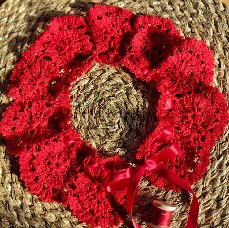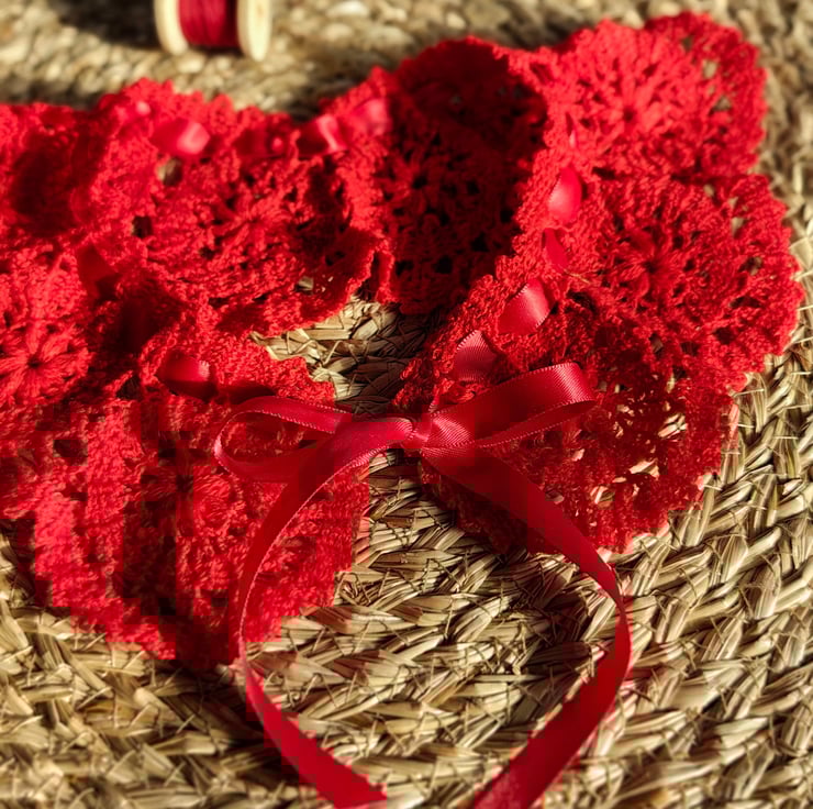 Made from crochet yarn and satin ribbon.