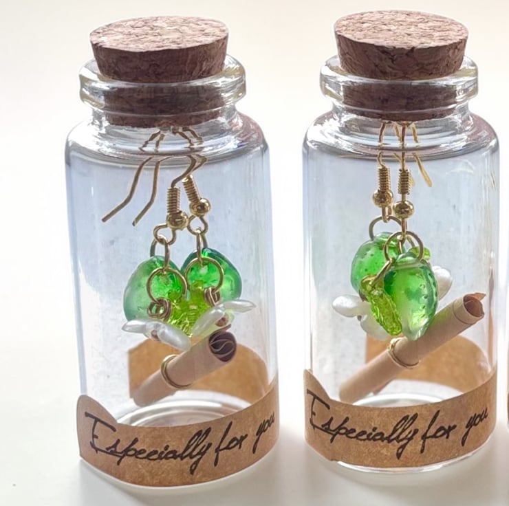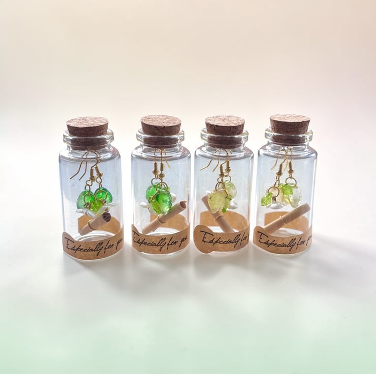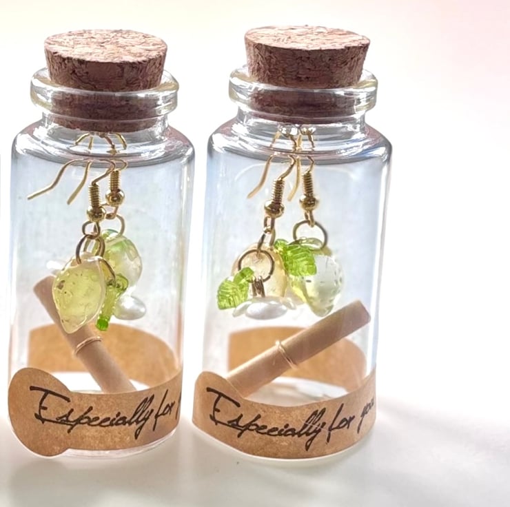 Add a splash of fresh, zesty charm to your look with these pretty handmade earrings! Each pair features delicate lemon and lime detail nestled inside a miniature glass bottle , a playful, eye catching design that's perfect for any season. The earrings are hooked to the cork inside the bottle, simply unhook them to wear and then pop them back in the bottle when you take them out.