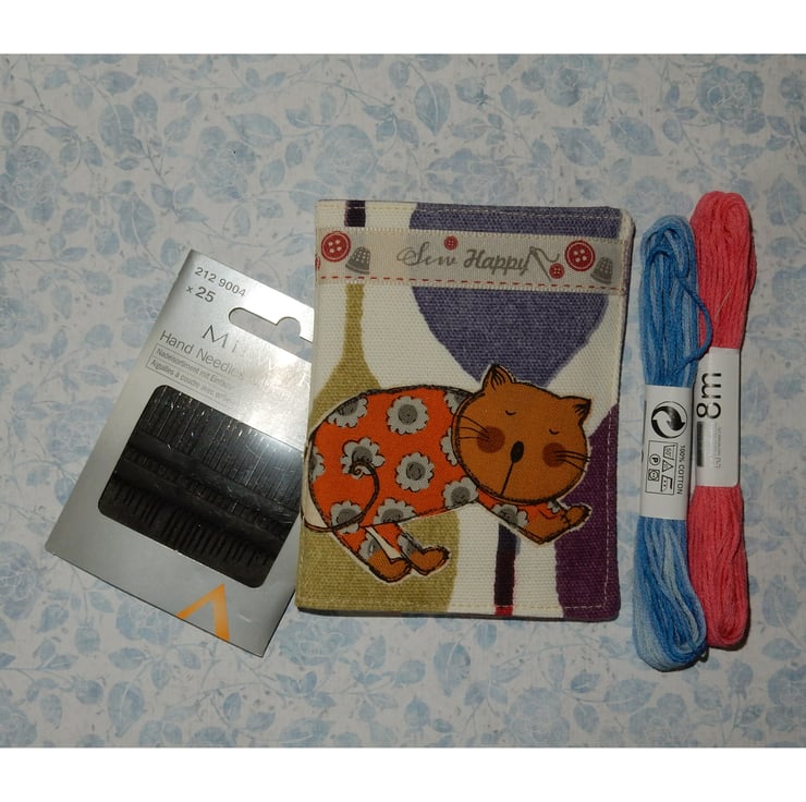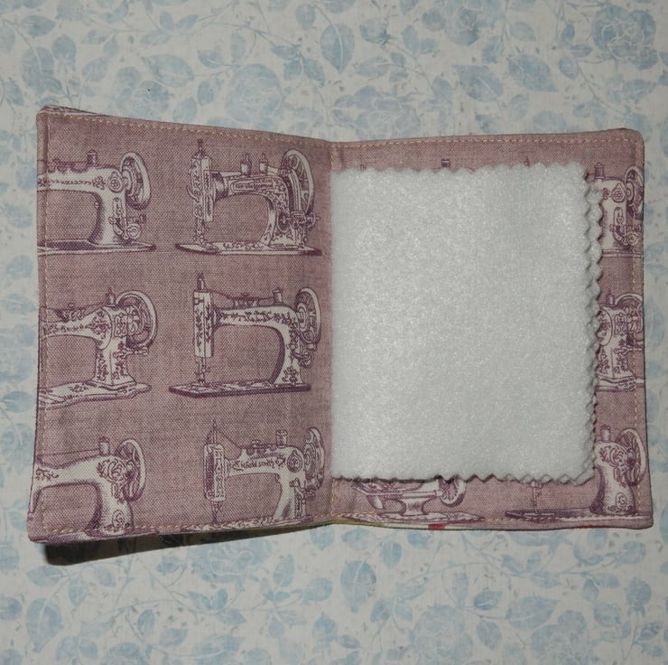 This attractive needle case is made from furnishing weight fabric, with an applique cat and a ribbon reading "Sew Happy" added. The fabric on the inside features vintage sewing machines in a toning lilac. The needle case measures approx. 4.5 x 3.5 inches (11 x 8.5cm) and has four felt leaves for your pins and needles.