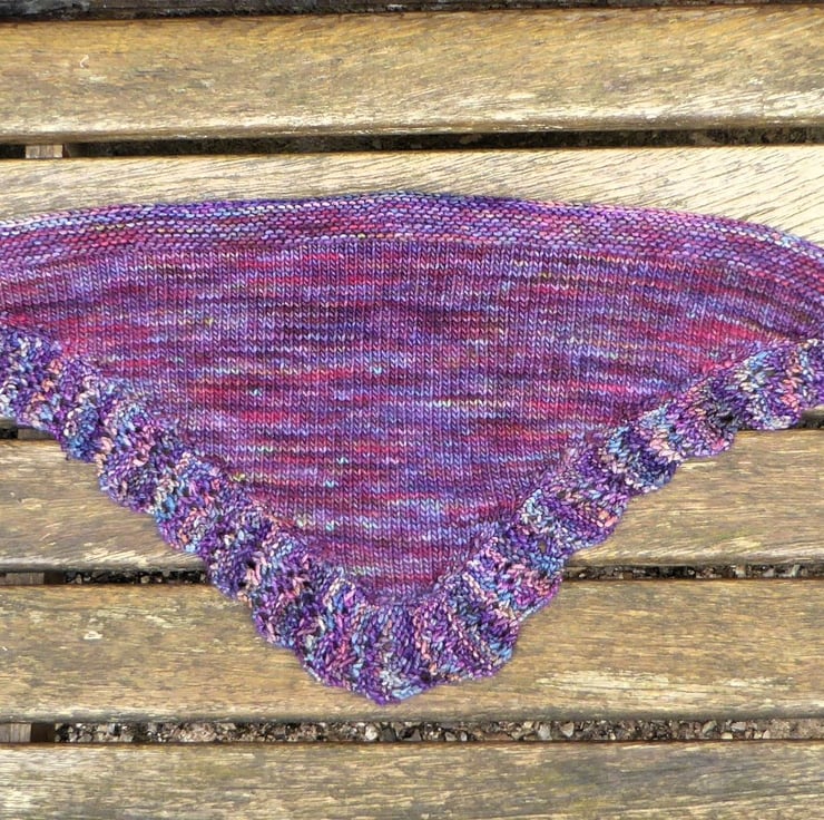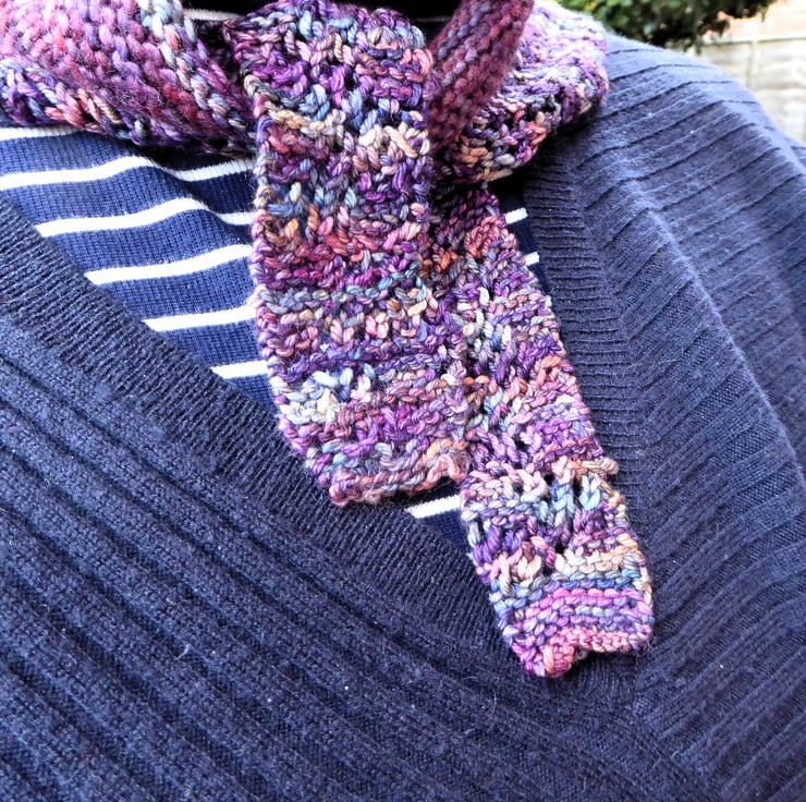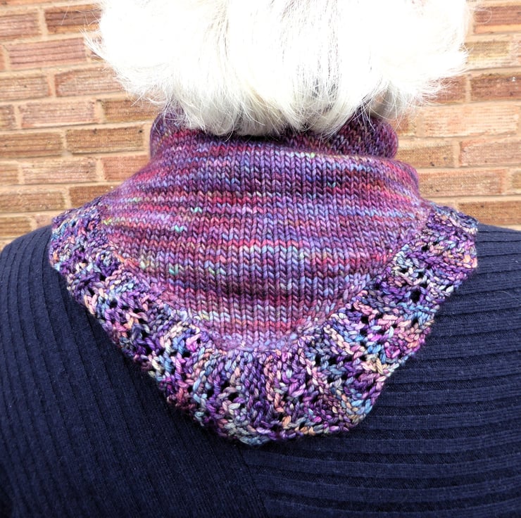 Shades of purple, random flecked, hand knitted merino wool 100% fibre, cosy, triangular neck and shoulder warmer for cooler days. Fits all sizes. Loop over ends and tie at front and can be secured with a scarf/shawl pin.