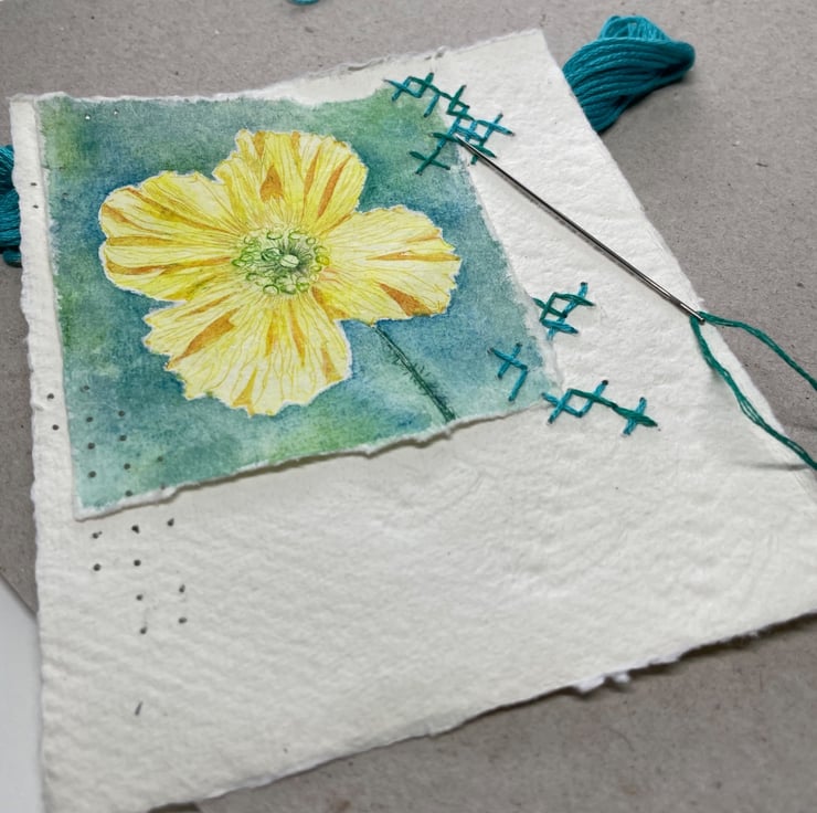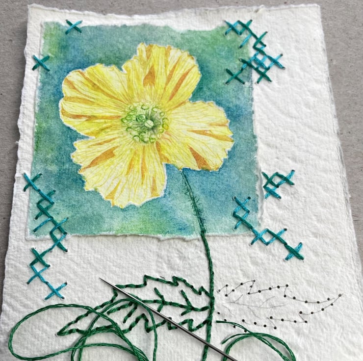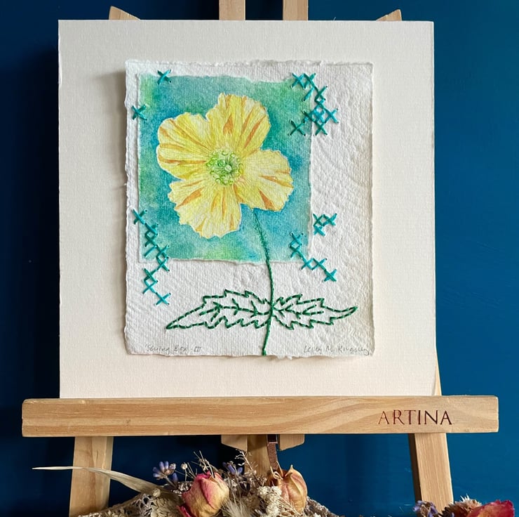 In this small piece I have used four different techniques. The poppy has been hand printed onto a piece of handmade 100% cotton rag paper. I created the printing plate by using TetraPak packaging from a fruit juice carton. The printed image has been stitched onto another piece of the cotton rag paper that has been blind embossed - using a beautiful crocheted table mat that was made by my grandmother. The image has been further embellished with a stem and leaf for the flower created using embroidery thread. The finished piece has been float mounted onto an ivory white piece of textured mount board.